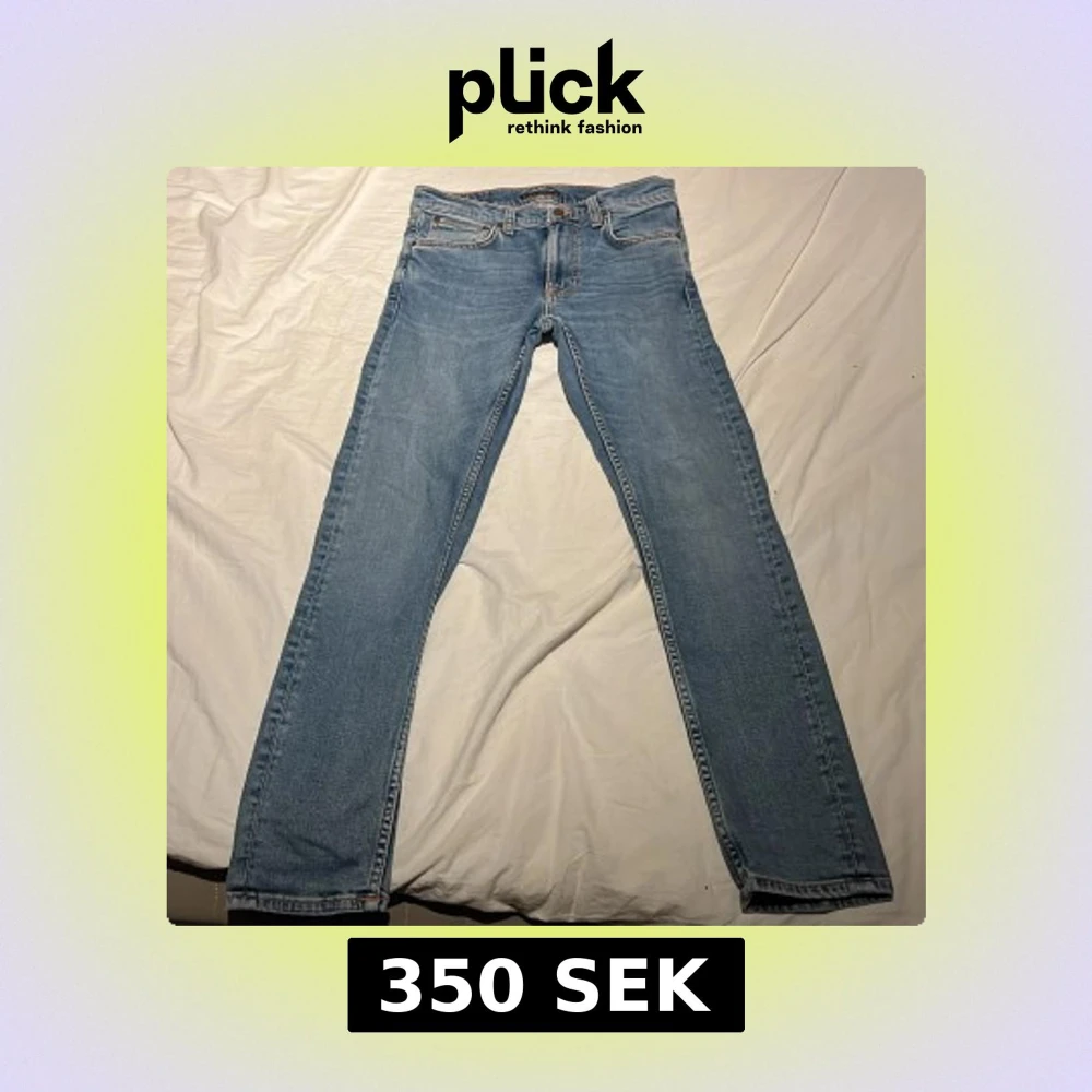 Snygga blå jeans från Nudie Jeans med klassisk femficksdesign och knappgylf. Tillverkade av ekologisk bomull med en bekväm passform. Perfekta för en avslappnad stil. Den går från lite större längst upp och går ner till lite tajtare vid vaderna. Något som passar dem som söker ett par fräscha jeans. Priset går att diskuteras.