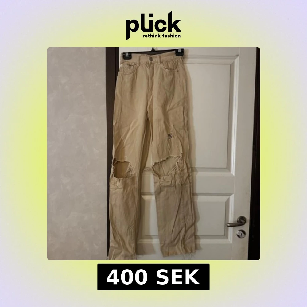 Säljer ett par beiga jeans med vida ben och stora slitningar på båda knäna. Byxorna har klassisk femficksdesign och råa kanter nertill. Perfekta för en avslappnad och trendig look.