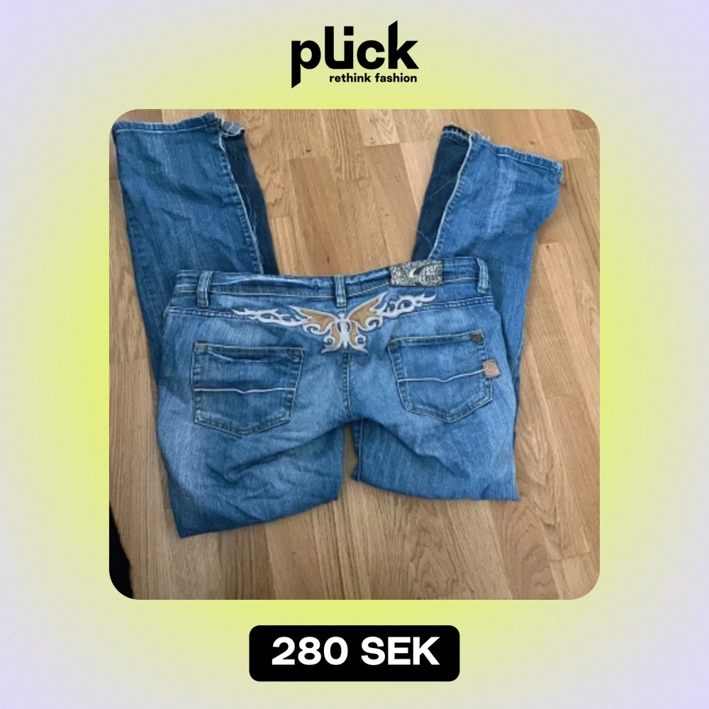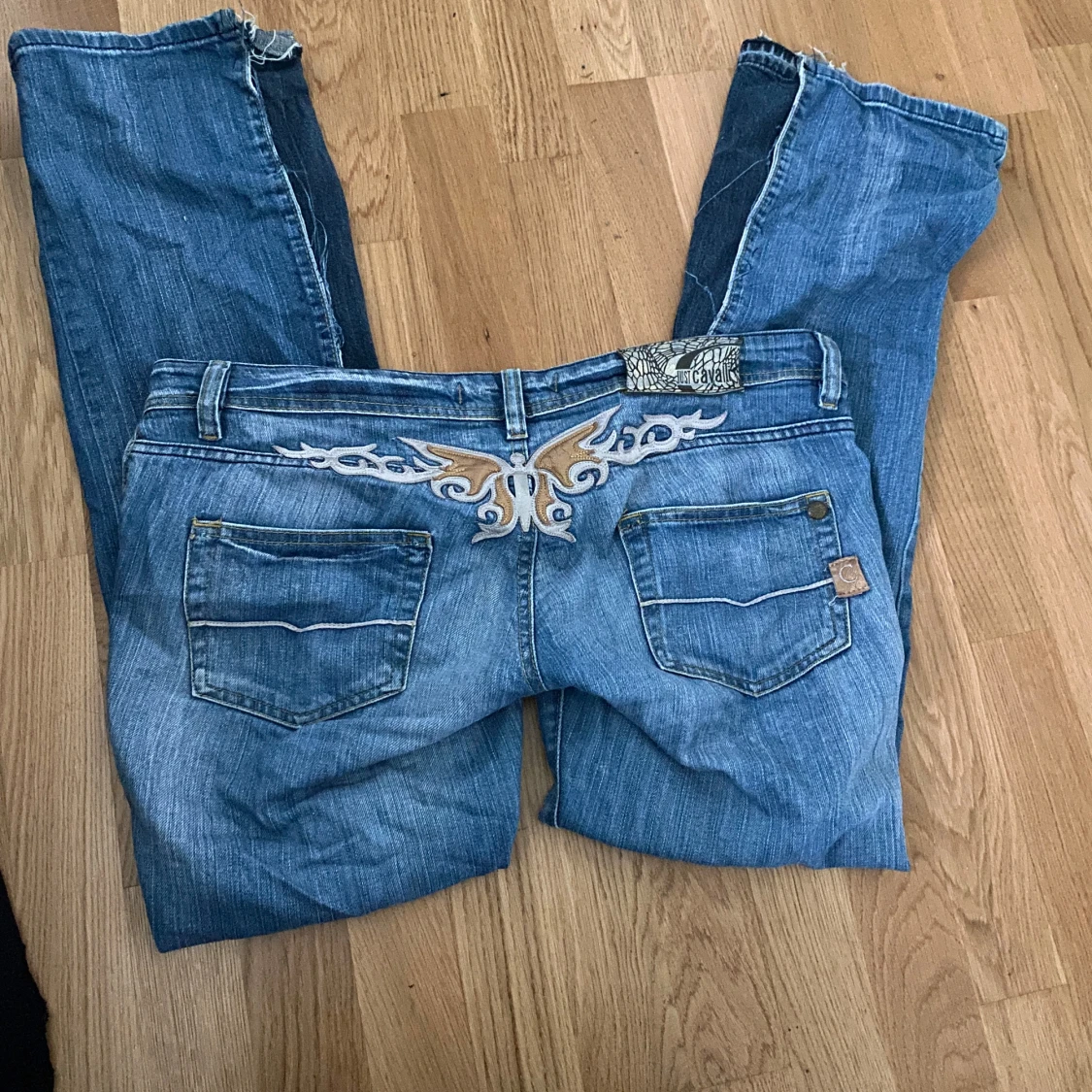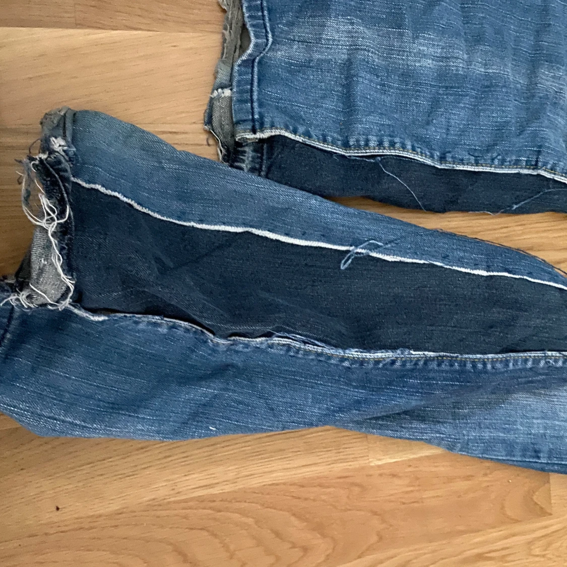 Köpte dessa för 500 och har sytt jeansen mer flared då de satt som skinny jeans innan men är nu för stora på mig vid midjan därför väljer jag att sälja dem. Har sytt lite dåligt som man ser på bilden 😹😹 midjemåttet är 88 cm innerben 82