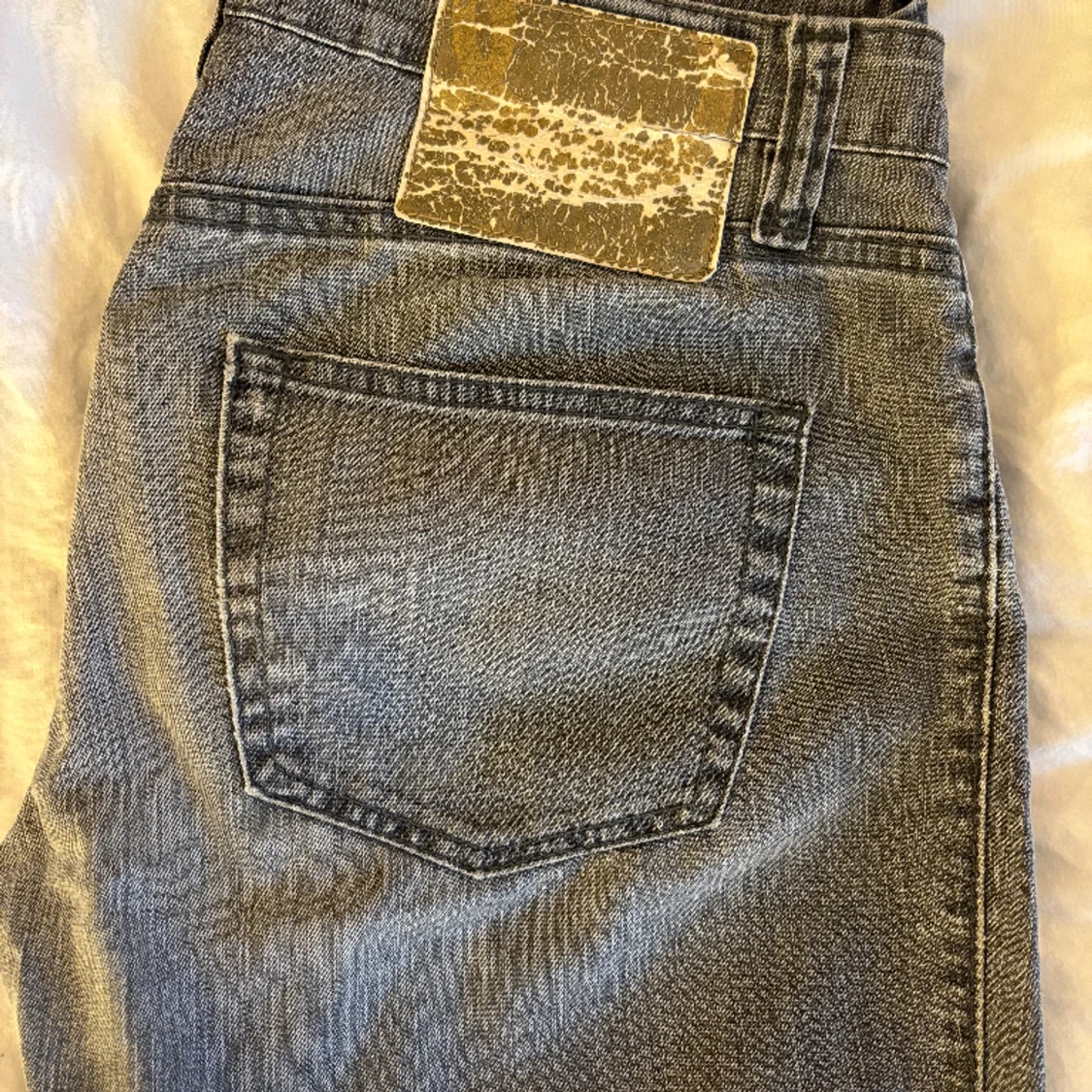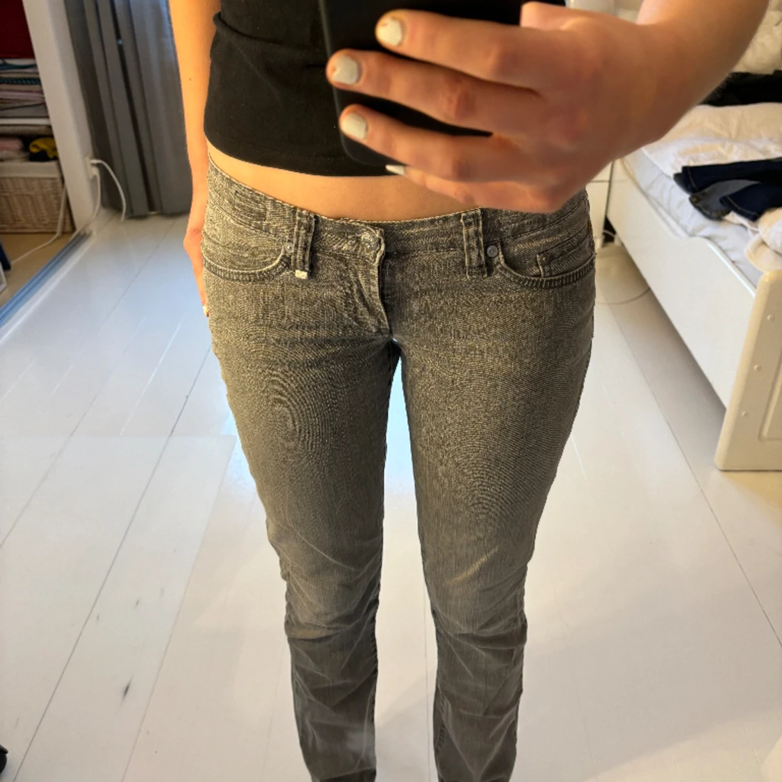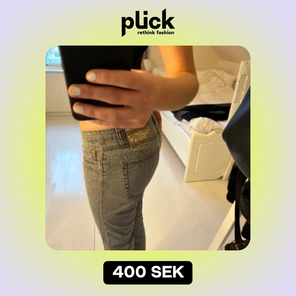 Snygga gråa och lågmidjade jeans, som är köpta second hand! W28 och är långa i benen.