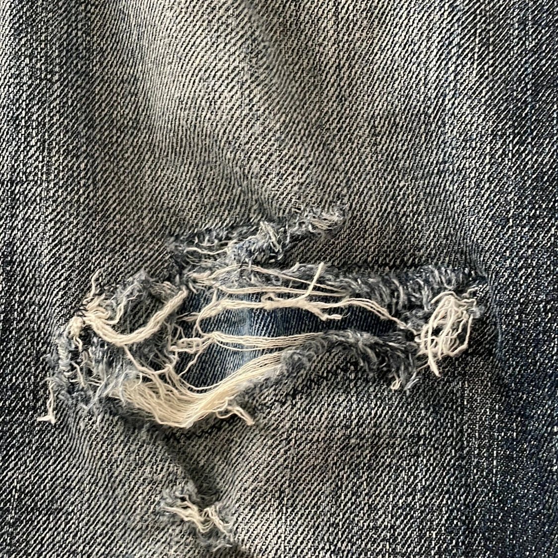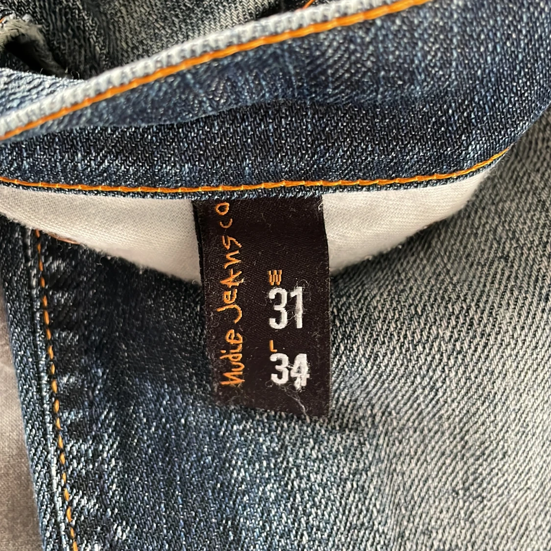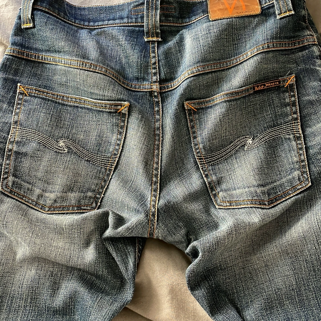 Snygga blå jeans från Nudie Jeans med slitna detaljer och en klassisk femficksdesign. Jeansen har en dragkedja och knappstängning samt en cool distressed look. Perfekta för en avslappnad stil. Hålen är ihopsydda med lapp bakom så man inte ser benen samt uppsydda till ungefär 32 i längd