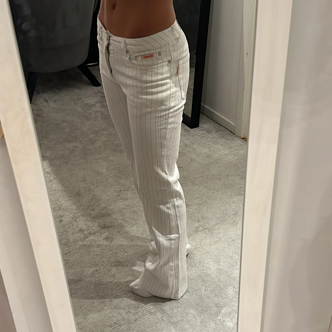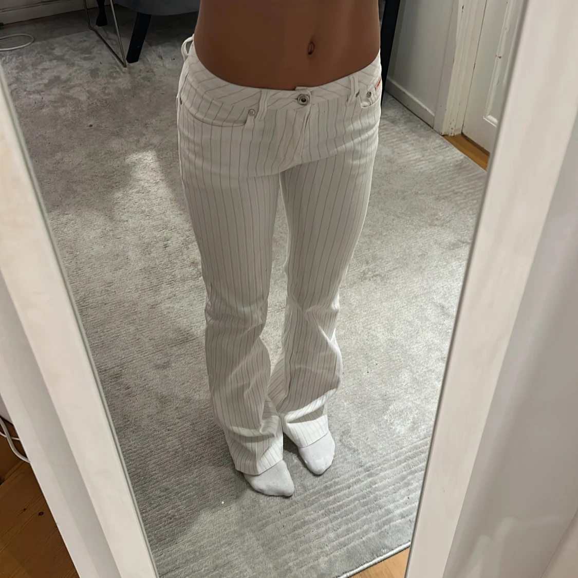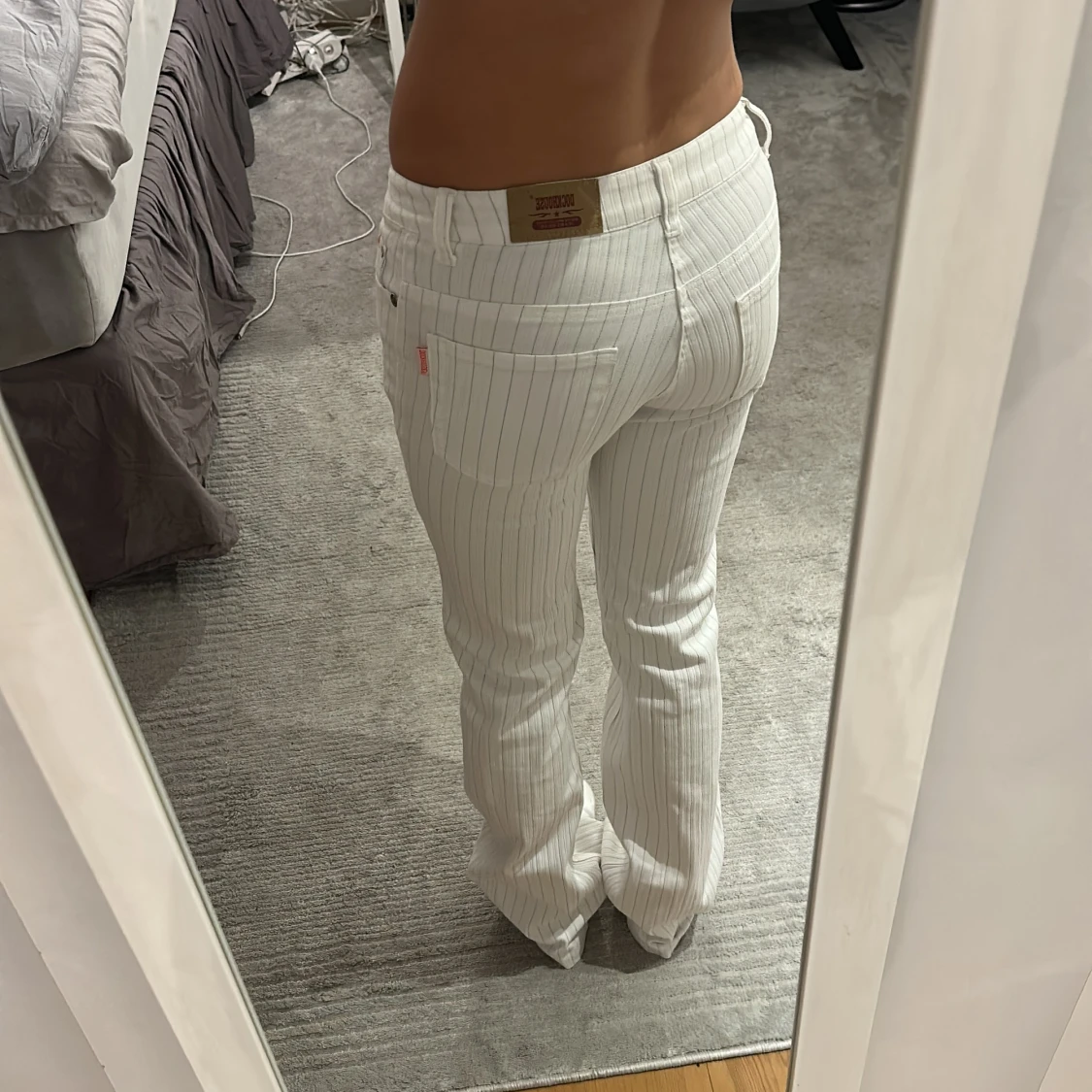 Skiiiiit snygga vita randiga byxorđ€© Unika och svĂ„ra att hittađ€© LĂ„gmidjade! UtsvĂ€ngda! MidjemĂ„tt: 34 cm InnerbenslĂ€ngd: 81 cm Jag Ă€r 161 cmâ€ïž Fri frakt i 7 dagar frammĂ„t!!