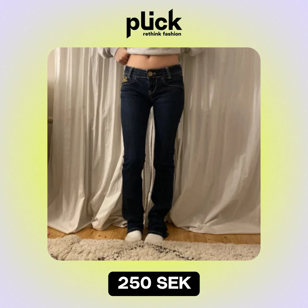 Mörkblåa jeans, ganska tighta. Fina detaljer