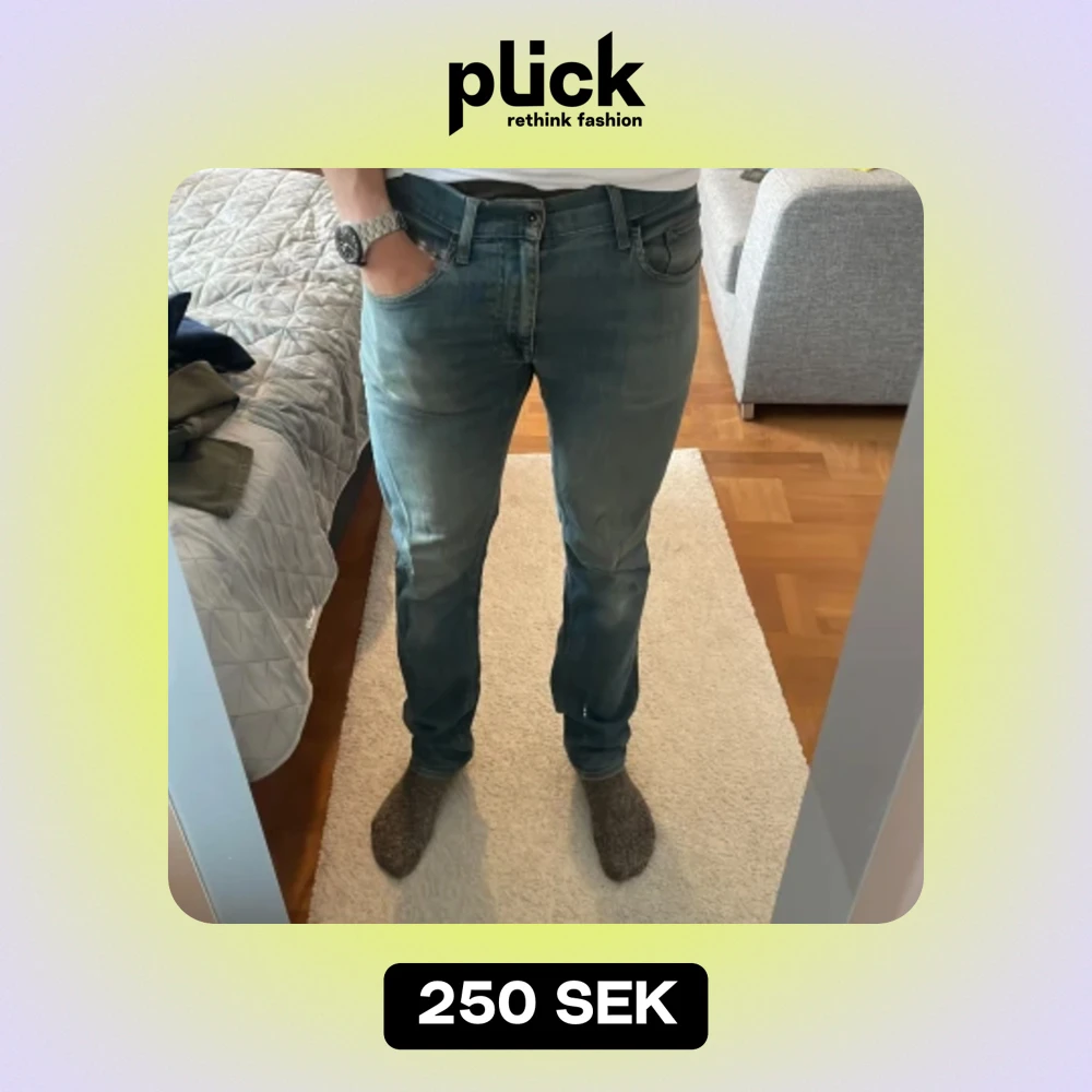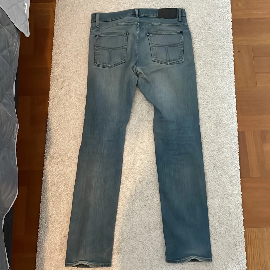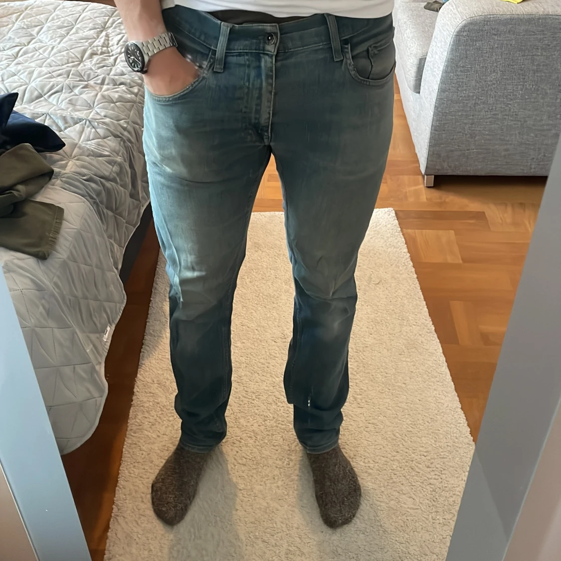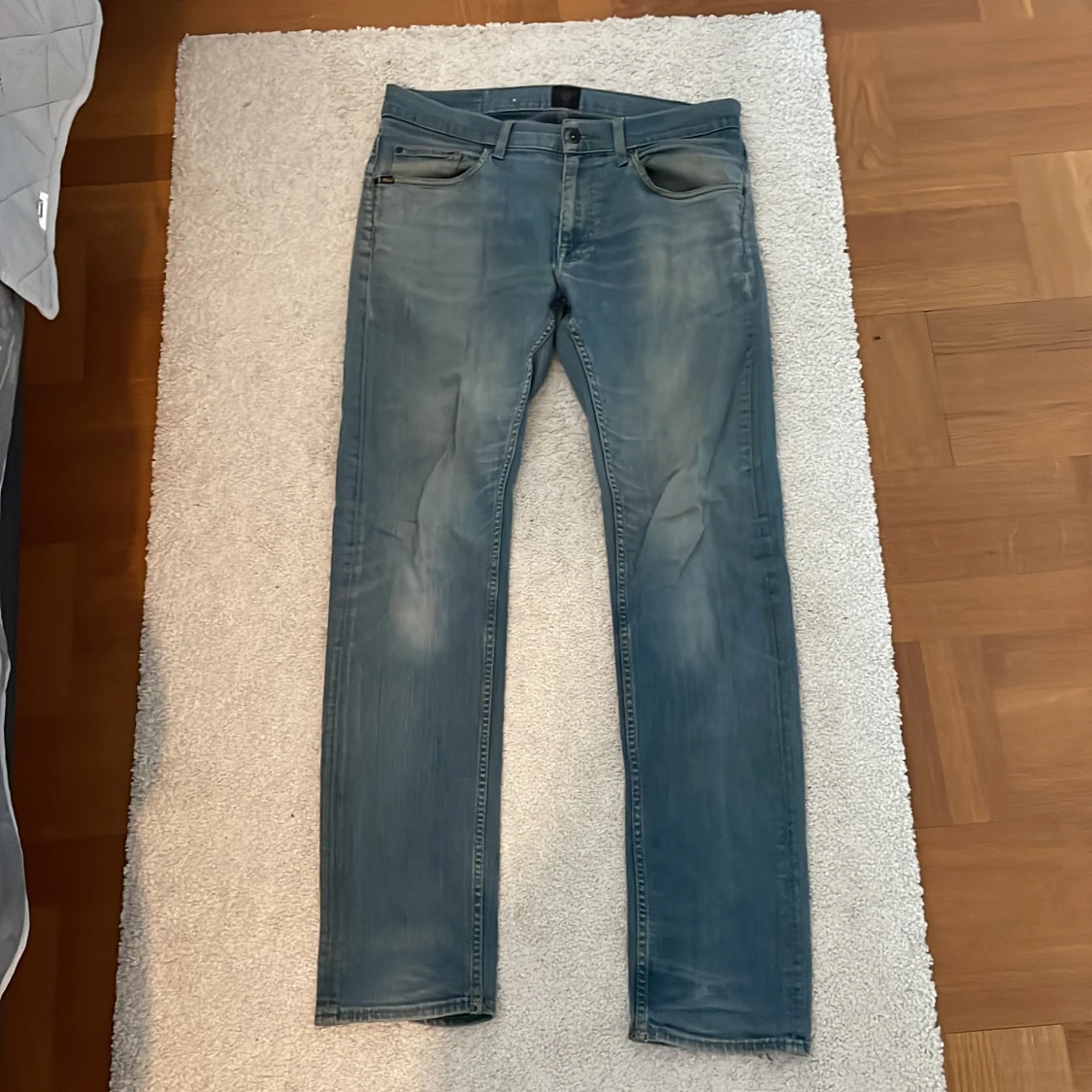 Säljer ett par riktigt schyssta jeans från tiger of Sweden. I bra skick förutom hålet i grenen som syns på 3e bilden, men borde lagas lätt. I stretchigt material, ett av de skönaste jeansen jag haft på mig. I storlek 34/34 men sitter mindre. Blågrå