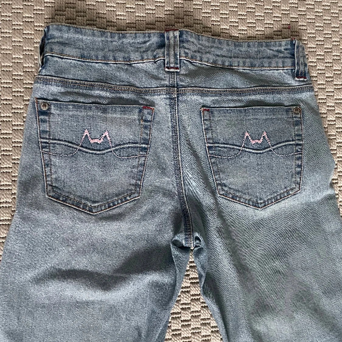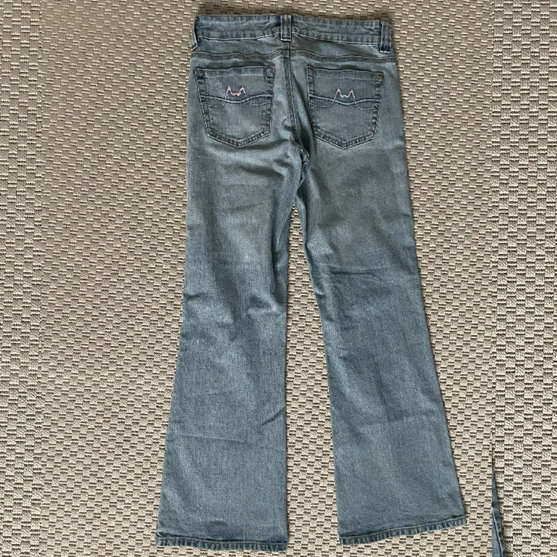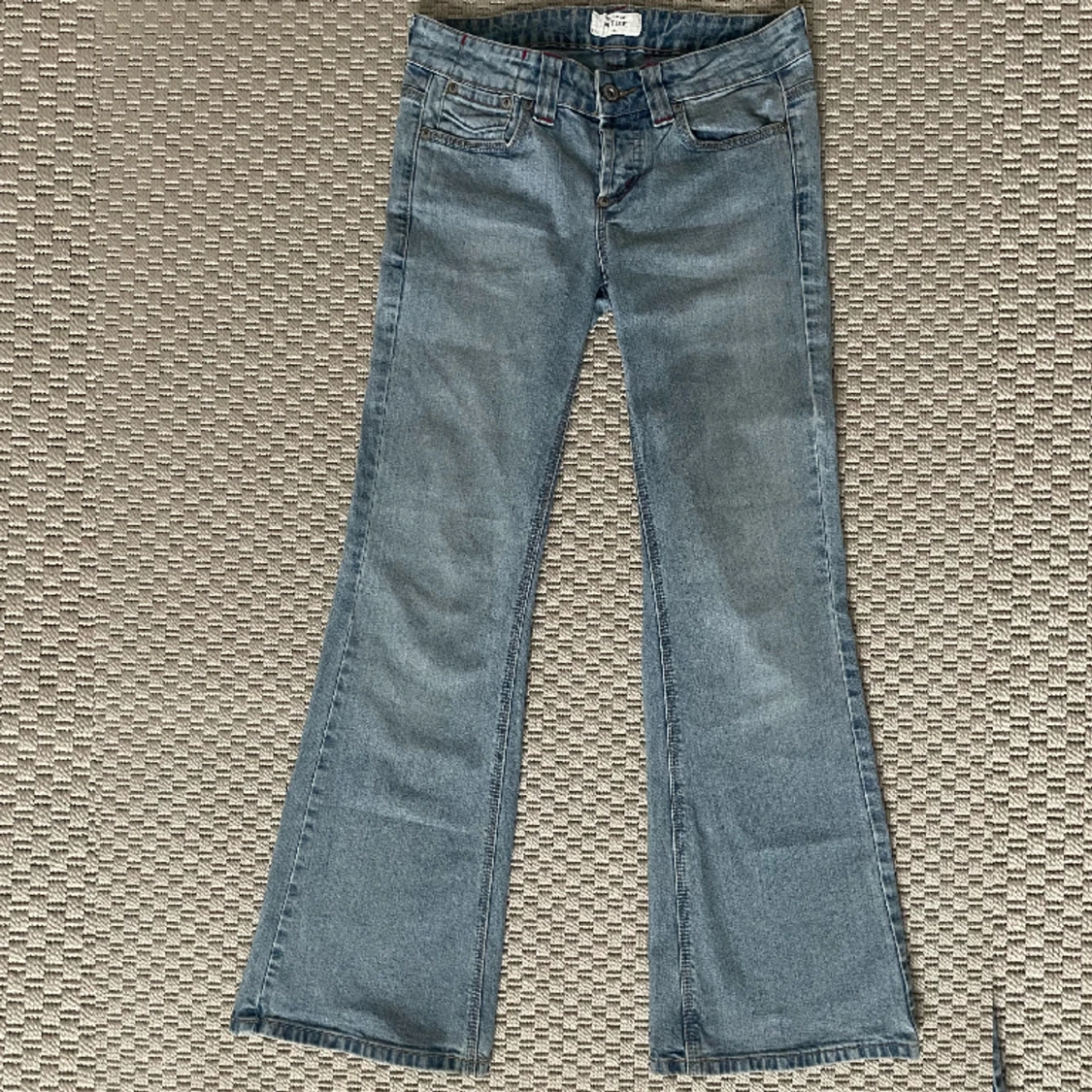 Ljusblåa väldigt lågmidjade bootcut jeans från top shop med snygga fickor, skriv till mig om ni vill veta de exakta måtten W27 L30💕 använd gärna köp nu🫶🏻