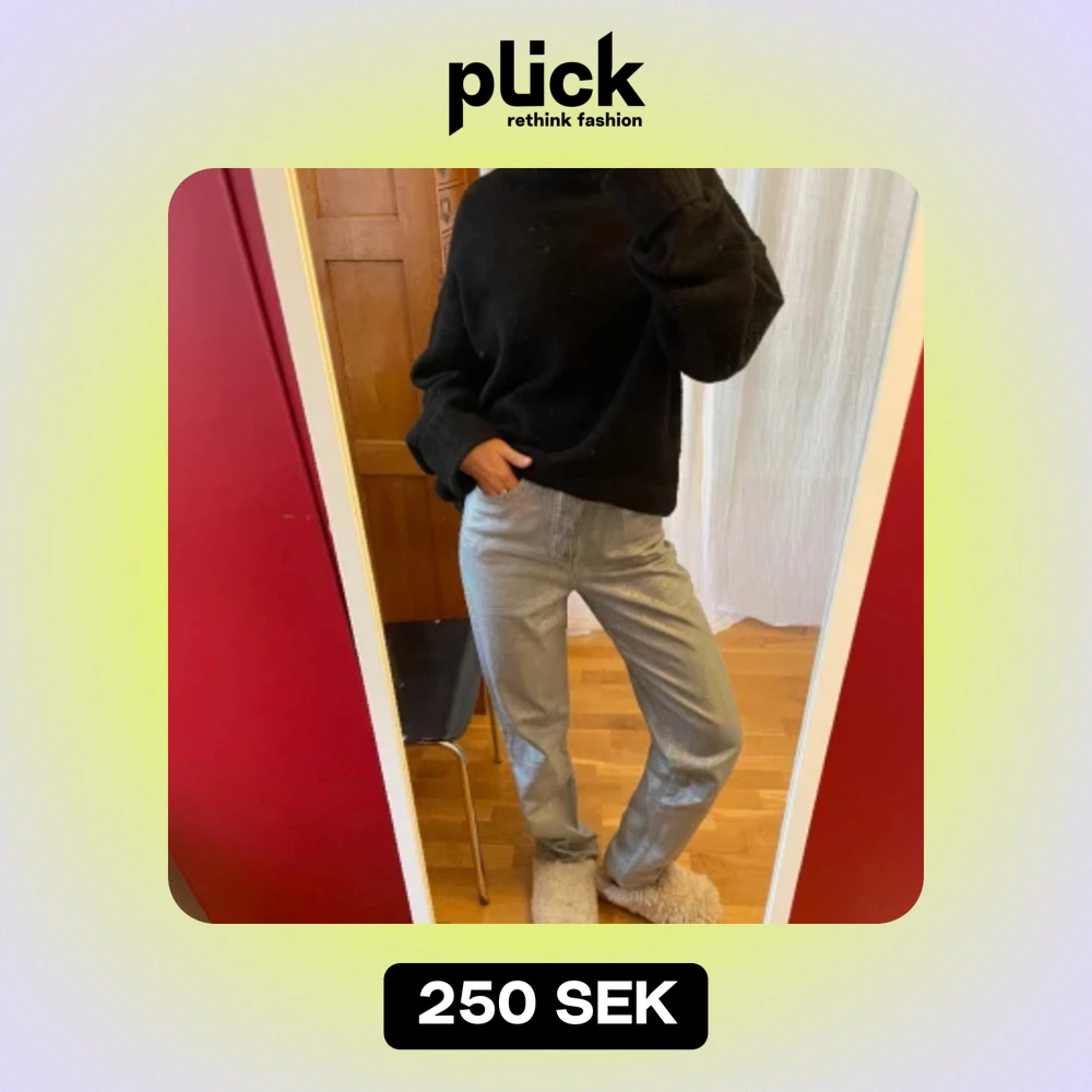 Så coola glittriga/glansiga ljusblåa jeans, riktiga partybyxor, använda en gång🤩
