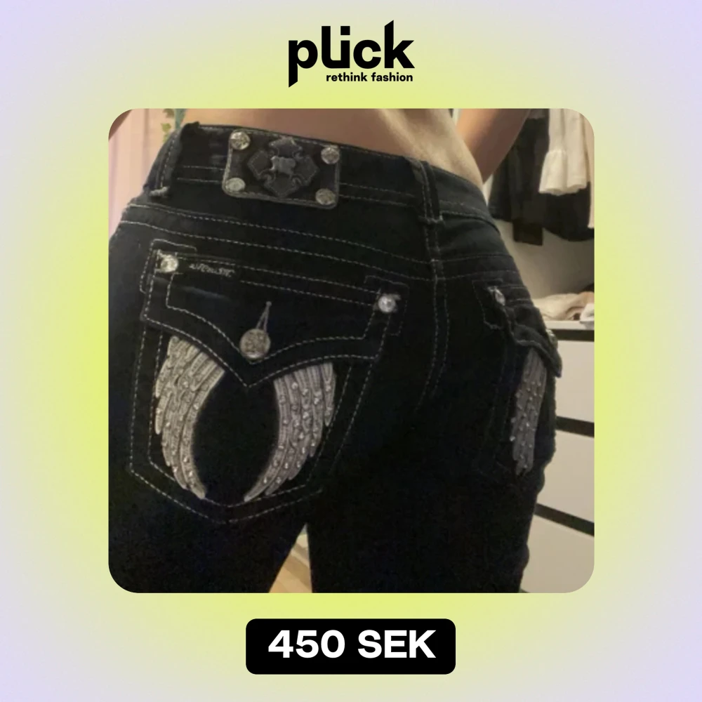 Low waist Miss Me Jeans med glittriga fickor. Kommer inte till användning så därför jag valt att sälja dem. Ser ut som helt nya då jag inte använt dem mer än 2 gånger.
