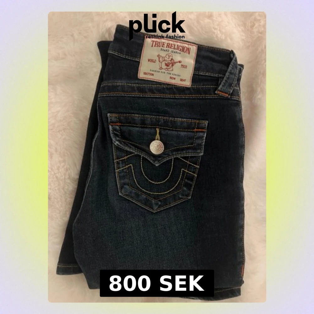 Mörkblå jeans från True Religion, modell Becca. Klassisk femficksdesign med kontrastsömmar och ikoniska ficklock bak med silverfärgade knappar. Tillverkade i slitstarkt jeansmaterial och har en snygg bootcut passform. Använda några ggr men har inga skador och färgen är inte urtvättad 💞