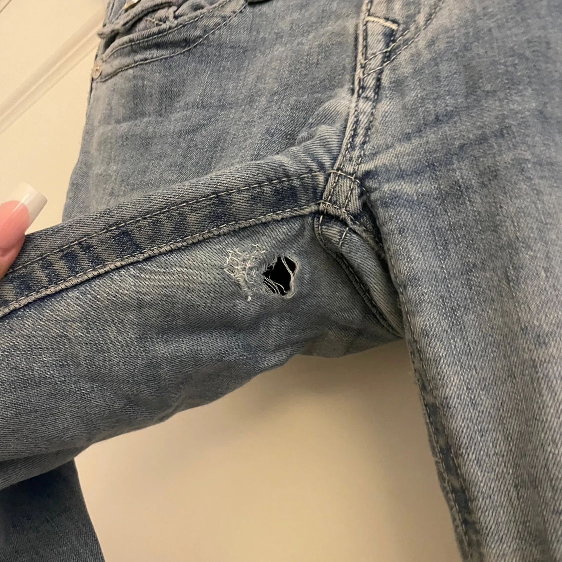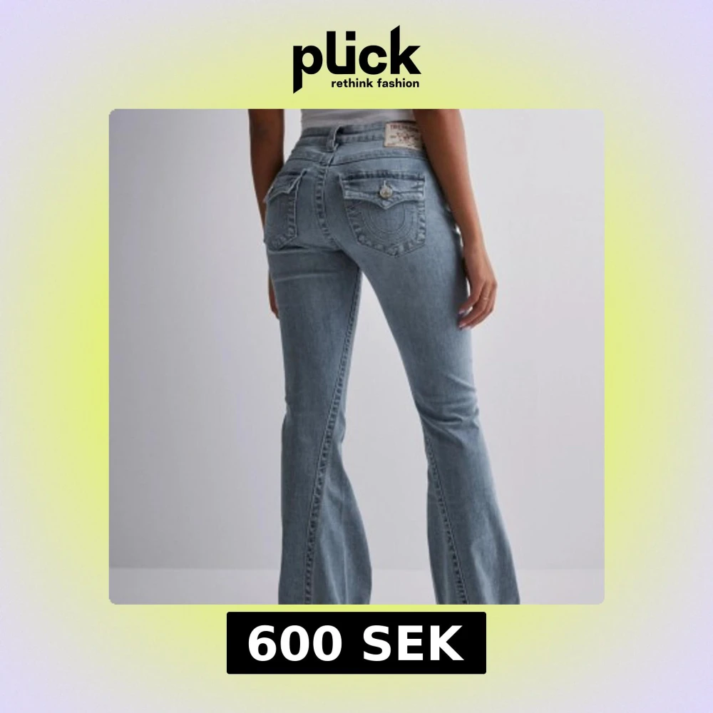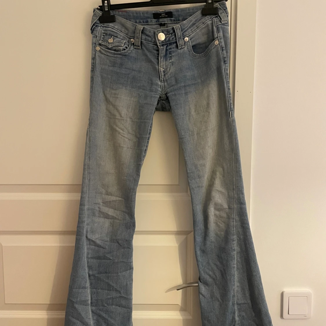 Säljer ett par ljusblå jeans från True Religion med bootcut passform och fickdetaljer. Jeansen har låg midja och är tillverkade i mjukt denim med snygga sömmar. Det finns ett hål på insida lår som inte syns när man har på sig dem, men om man vill kan man sy hålet. Annars är de i bra skick! Pris kan diskuteras ❤️