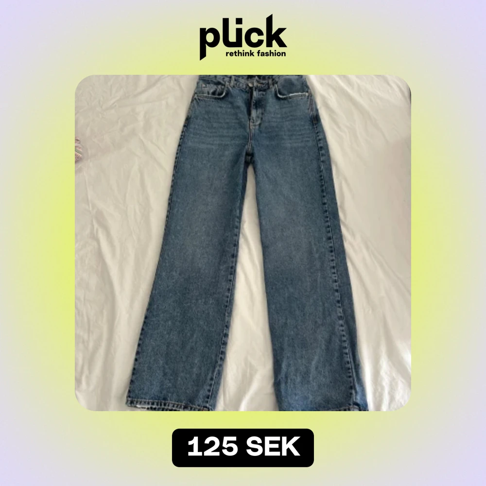 högmidjade blåa utsvängda jeans som aldrig är använda ! W30 L32, endast tajta över höfterna/rumpan annars utsvängda ! slitningarna på fickorna och sömmen där nere på byxbenen ska vara där, var så när jag köpte :) mått står på bilden, inte stretchiga