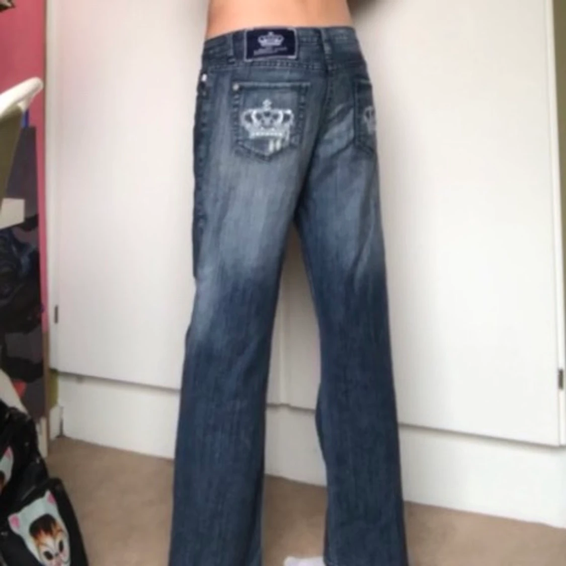 HÅLLER PÅ ATT SÄLJA TILL NÅGON Köpte de på plick men var för korta enligt mig😞 Innerbenslängd: 68 cm Midjemått: tvärs över midjan 40 cm. De har snygga slitningar på båda benen och en på bakfickan!💖 Kronorna är ljusblå om det inte syns på bilderna!