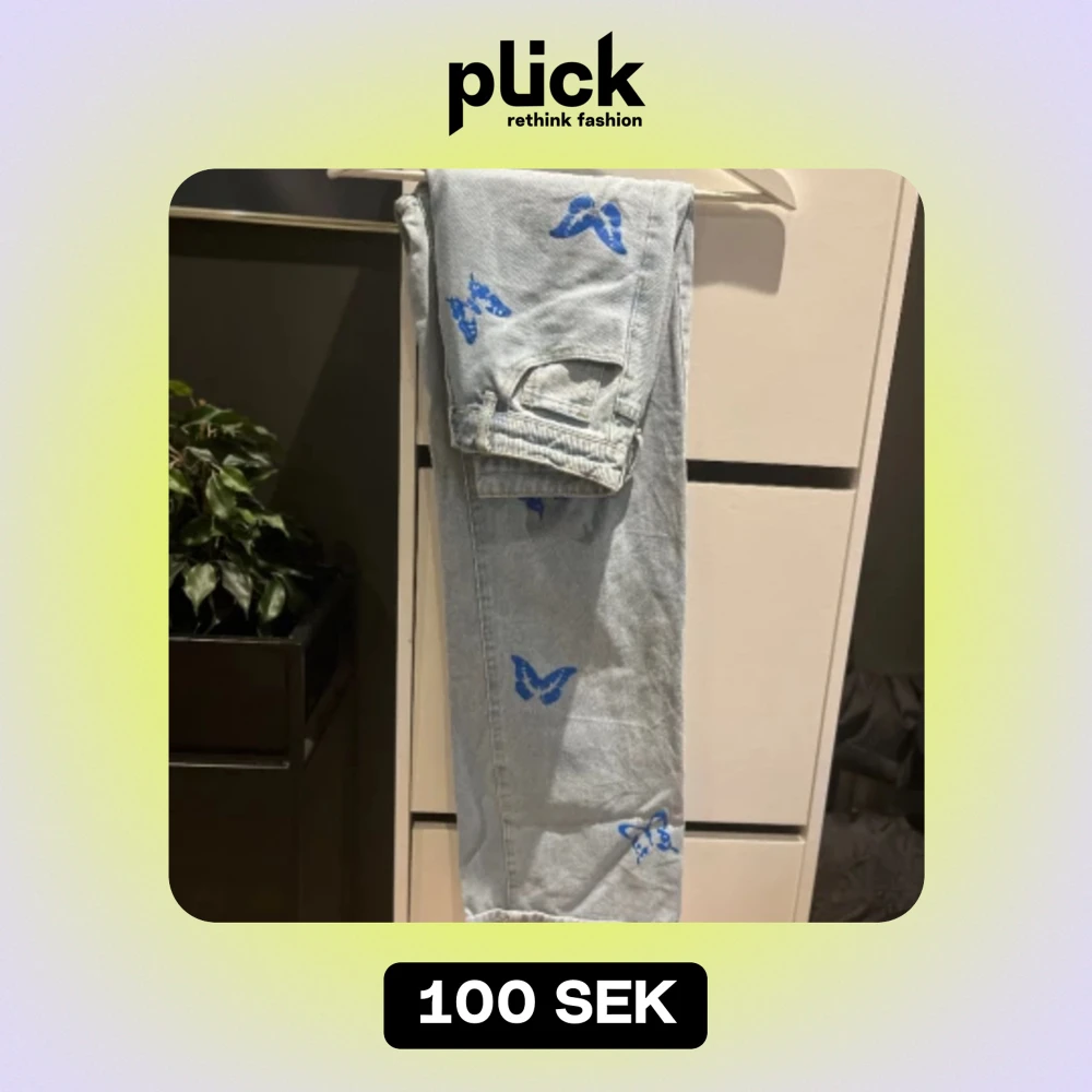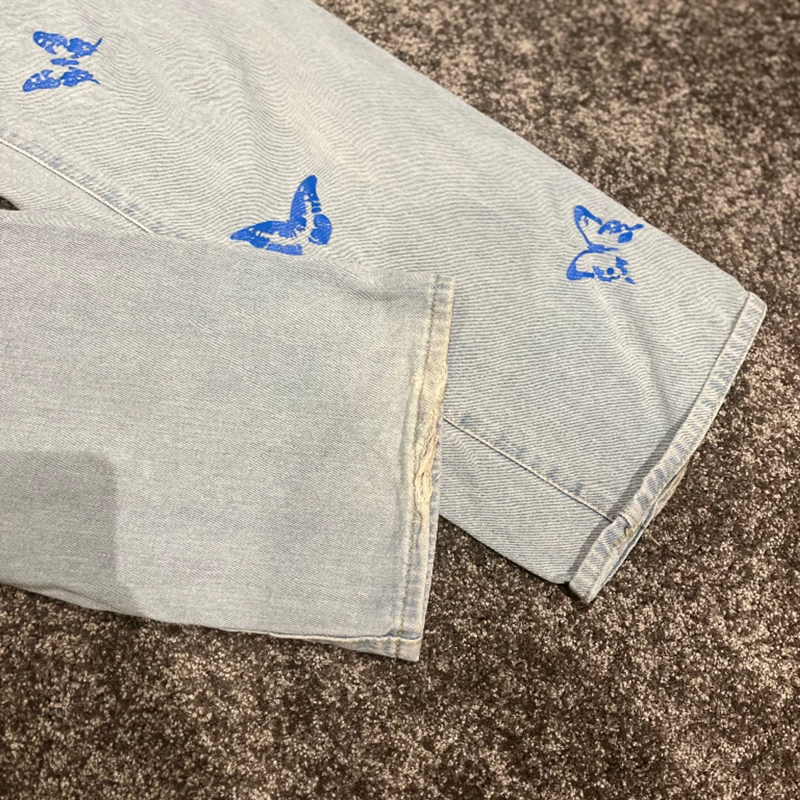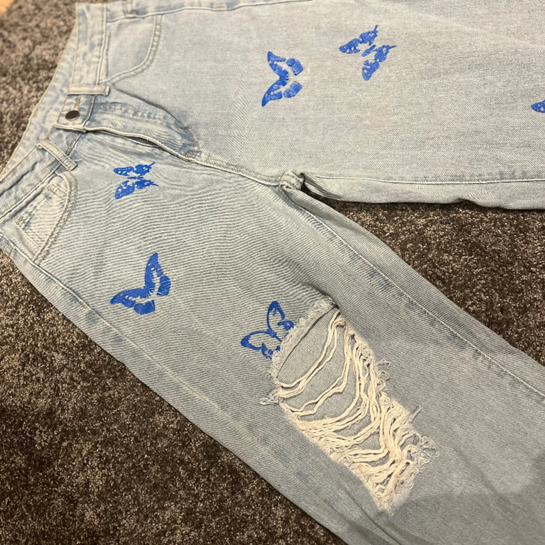 Säljer mina jättefina jeans med fjärilar, använda 1-2 gånger med inga defekter alls! Står att det är storlek XS men passar även S🫶🏻