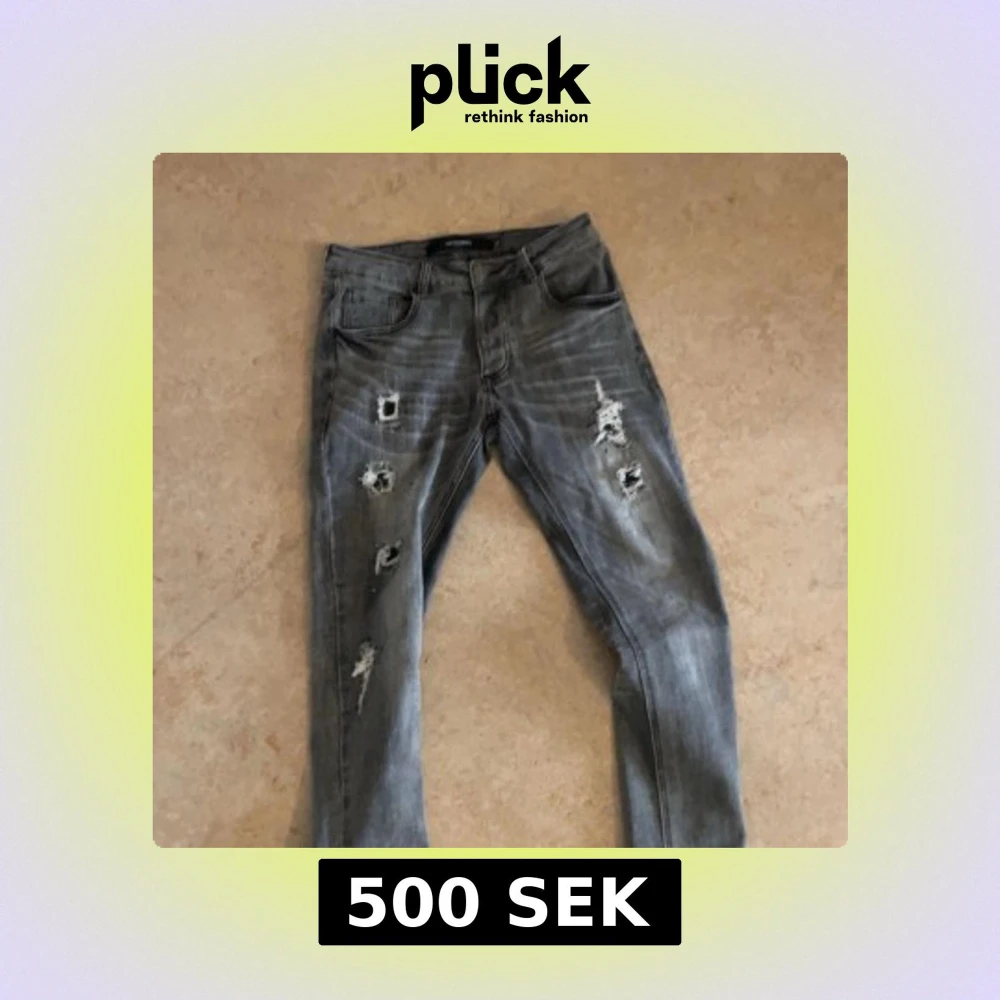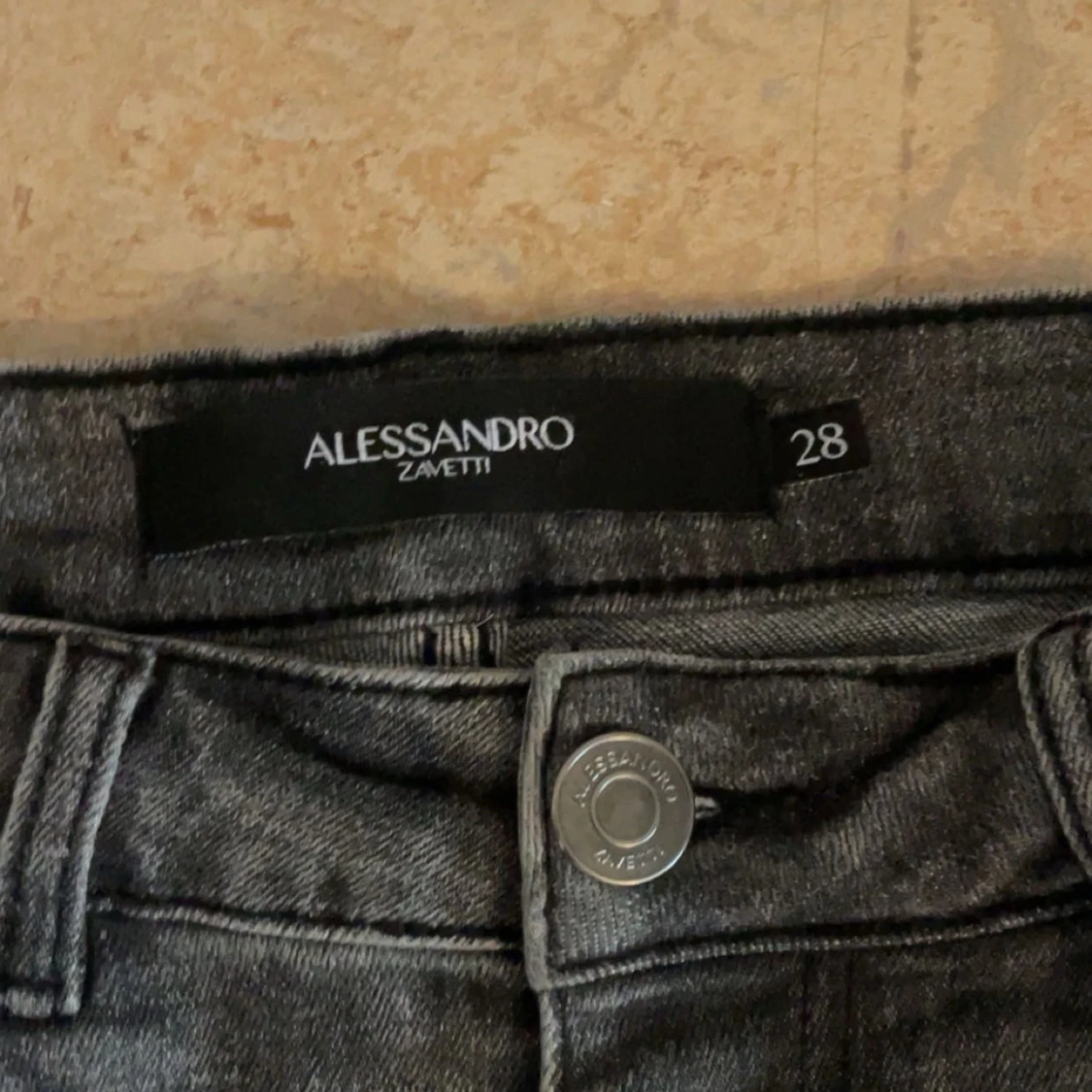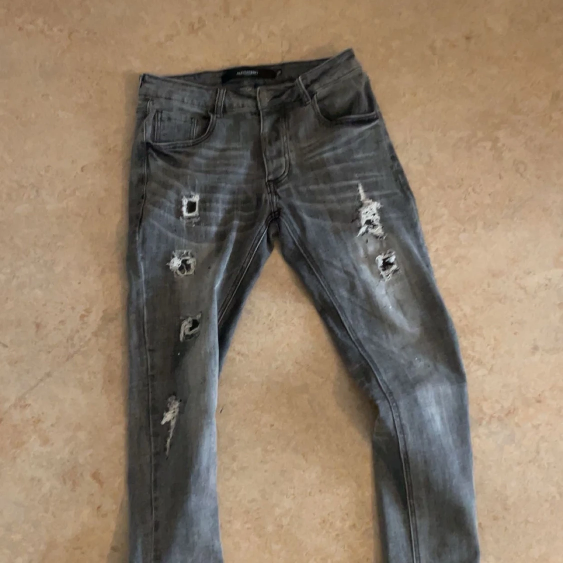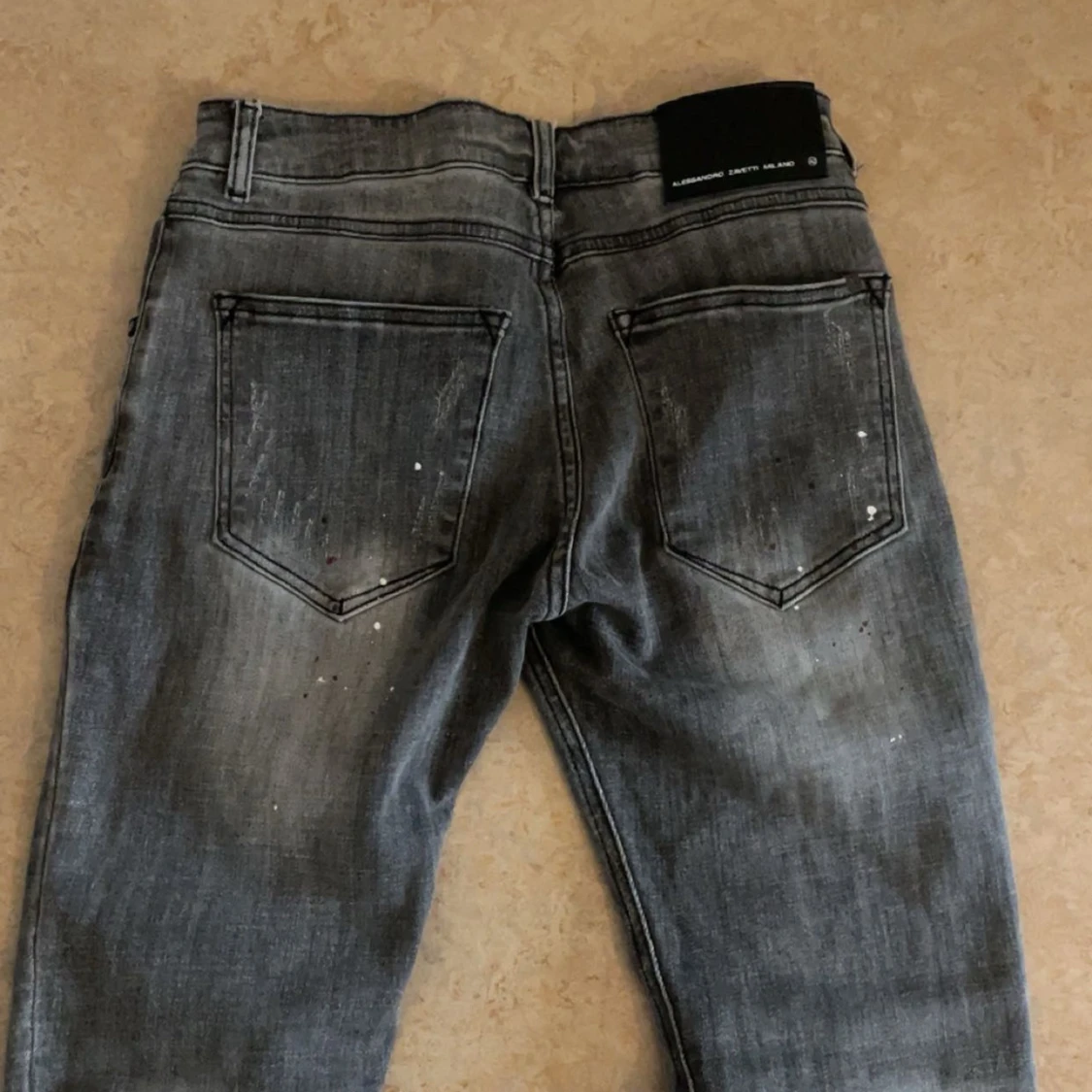 Säljer ett par grå jeans från Alessandro Zavetti med slitna detaljer och en cool, distressed look. Byxorna har en klassisk femficksdesign och knappgylf. Perfekta för en avslappnad stil.