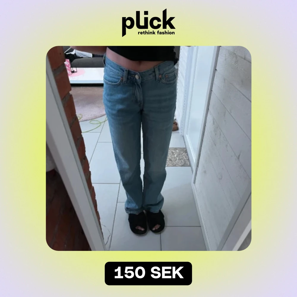 Blåa lågmidjade jeans från Weekday. Dom är storlek 27 i midjan och 32 i längden. Jag är 165 cm och dom är bra i längden på mig. Använda typ 2 gånger och inga fel🫶🏽