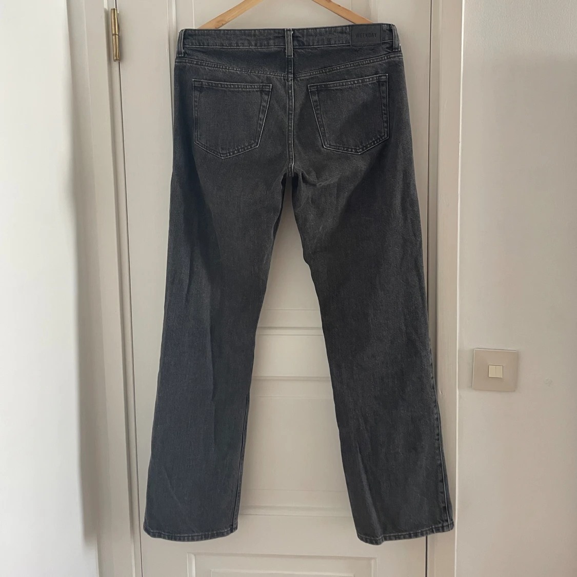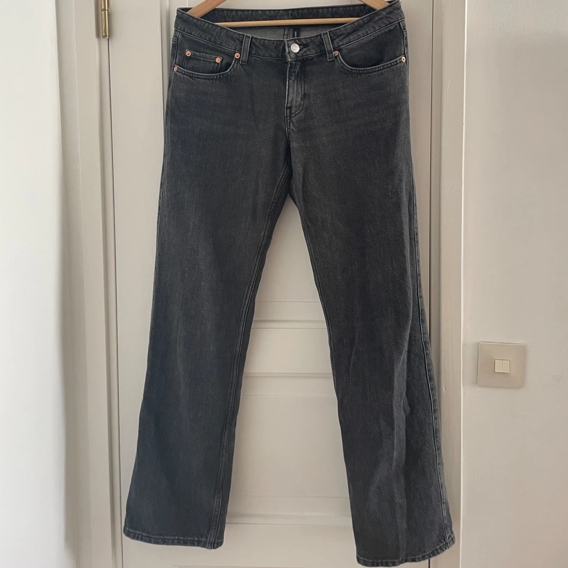 Ett par svart/gråa low arrow jeans från märket weekday. De är knappt använda och i ny-skick. Storlek 29 i midjan och 39 i längd (29x32). Köpte dem för 500kr och säljer dem för 350kr.