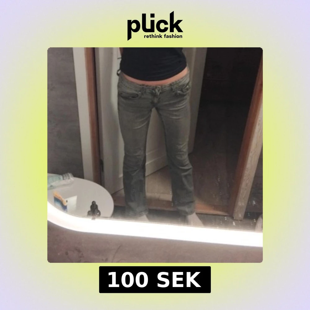 Snygga grå jeans med låg midja och bootcut-stil. De har klassiska fem fickor och en dragkedja framtill. Perfekta för en avslappnad look.