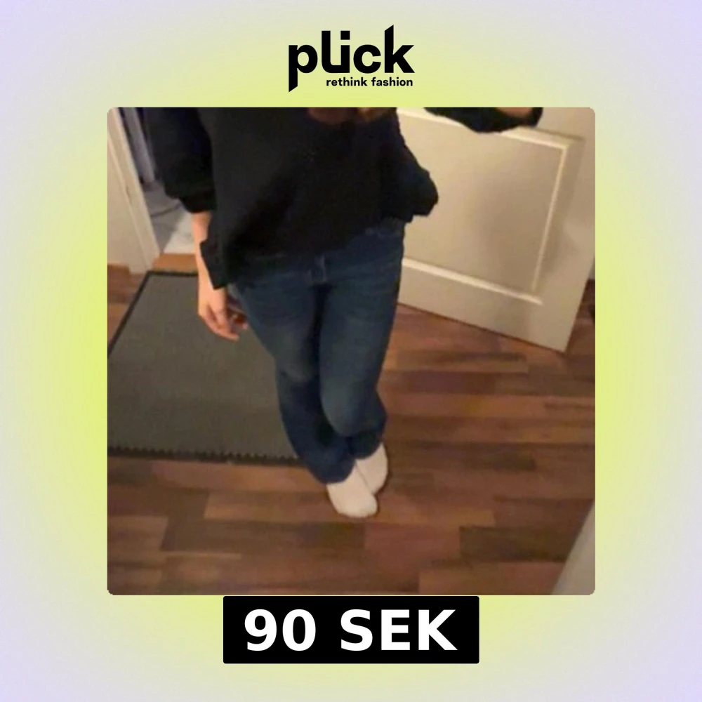 Snygga mörkblå jeans med bootcut-modell och hög midja. Jeansen har klassiska fickor fram och bak, dragkedja och knapp i midjan. Materialet är stretchigt jeans som sitter tajt upptill och släpper ut vid benslutet för en trendig siluett. De är storlek XS men de är väldigt stretchiga då jag vanligtvis använder storlek S