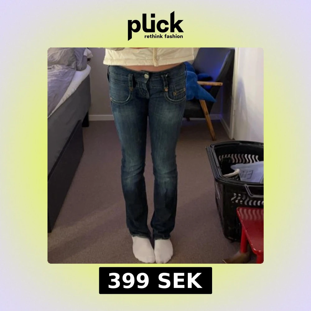 Snygga mörkblå jeans med bootcut och låg midja. De har klassiska fem fickor och en knappgylf. midjemåttet rakt över 38cm och inerbenslengden är 75cm.