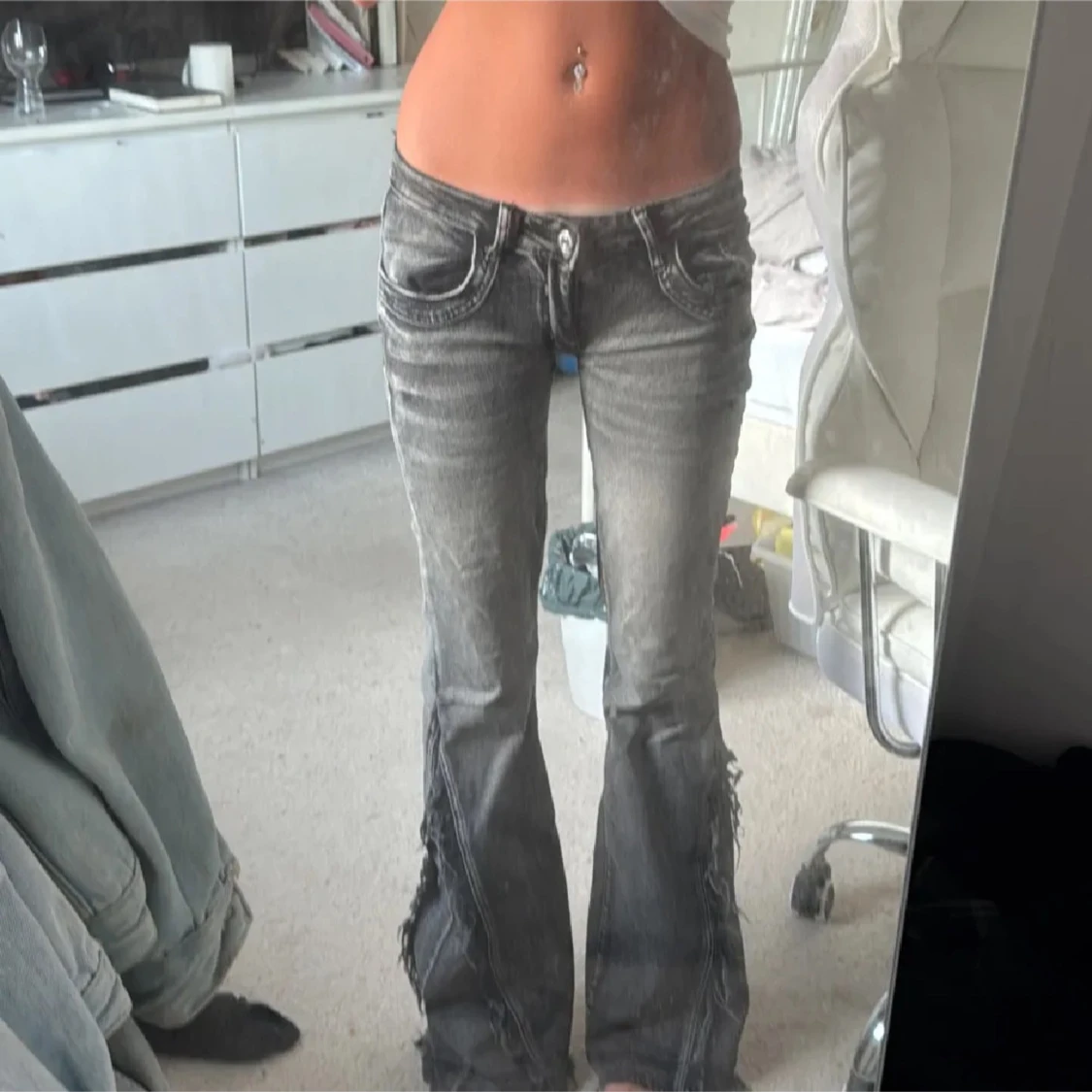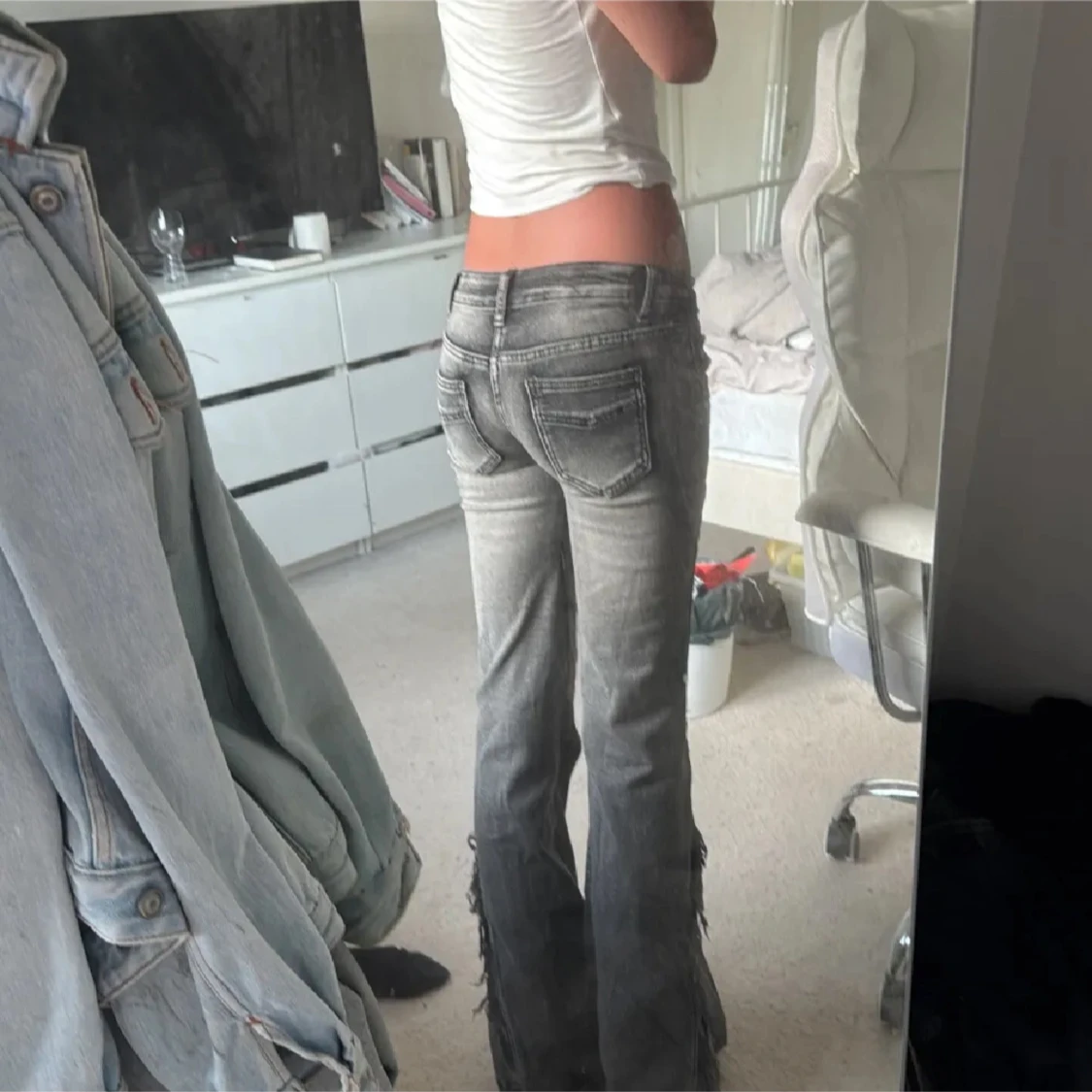 Säljer ett par grå jeans som jag sytt lågmidjat själv med sy symaskin. Jeansen har slitna och fransade detaljer vid benet. Midjemått: 34 Innerbenslängd: 82 Midjehöjd: 18 💓