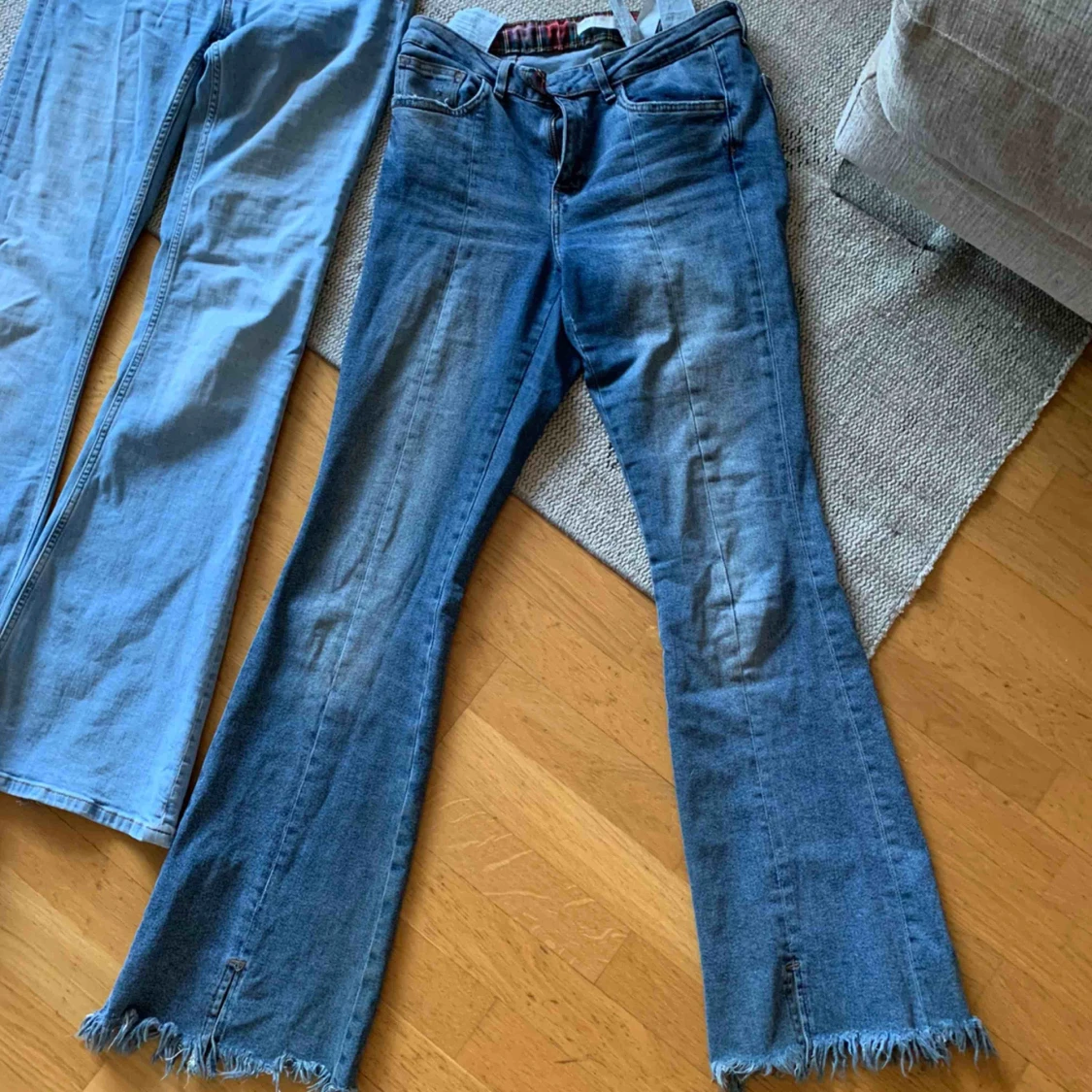 Bootcut jeans från Zara, dom i strl 42 skulle jag inte påstå är en 42 utan mer en 38/40 (Zaras strl är jätteskeva), dom blåa är båda i bra skick, dom gråa är väldigt slitna och har klippt hålet själv därav billiga