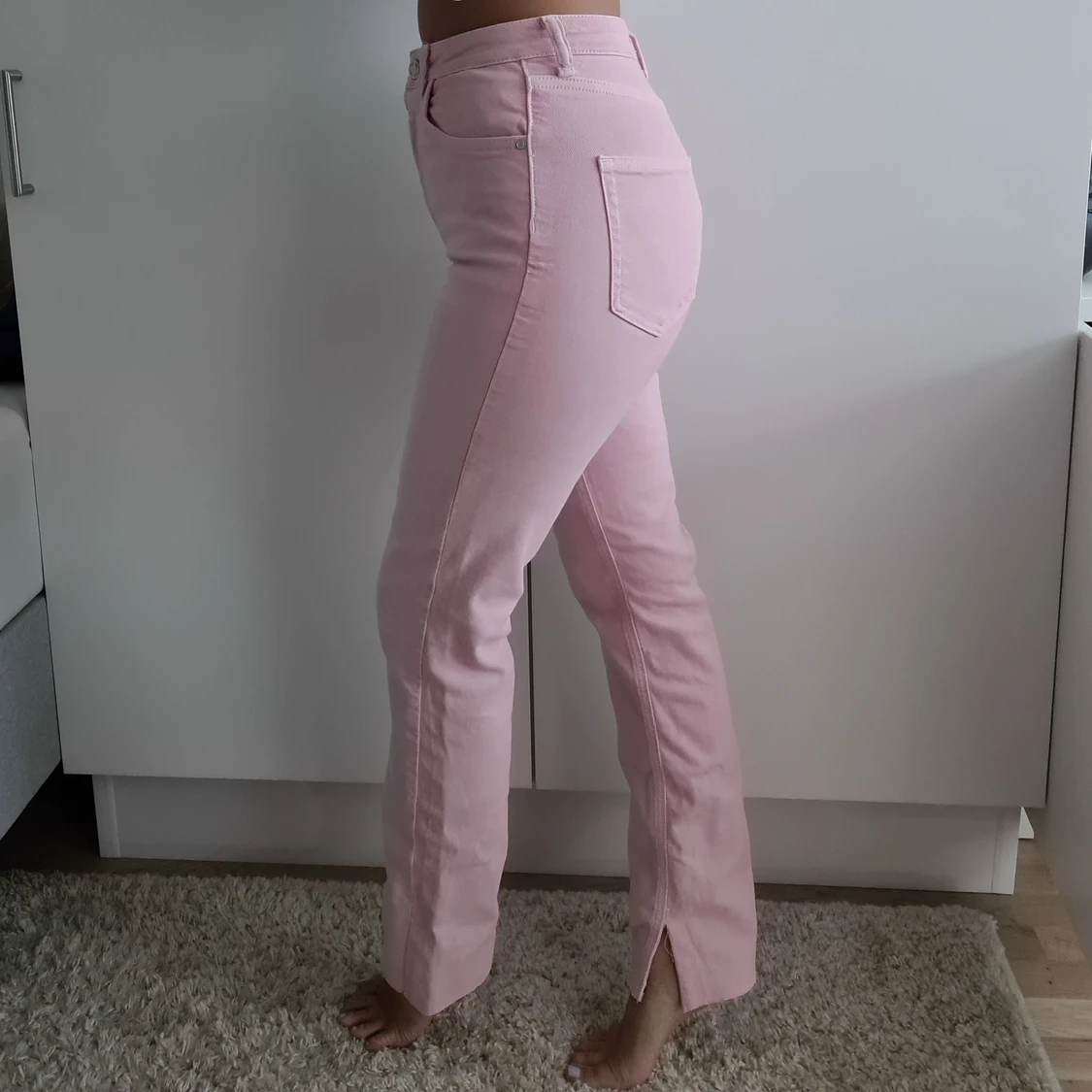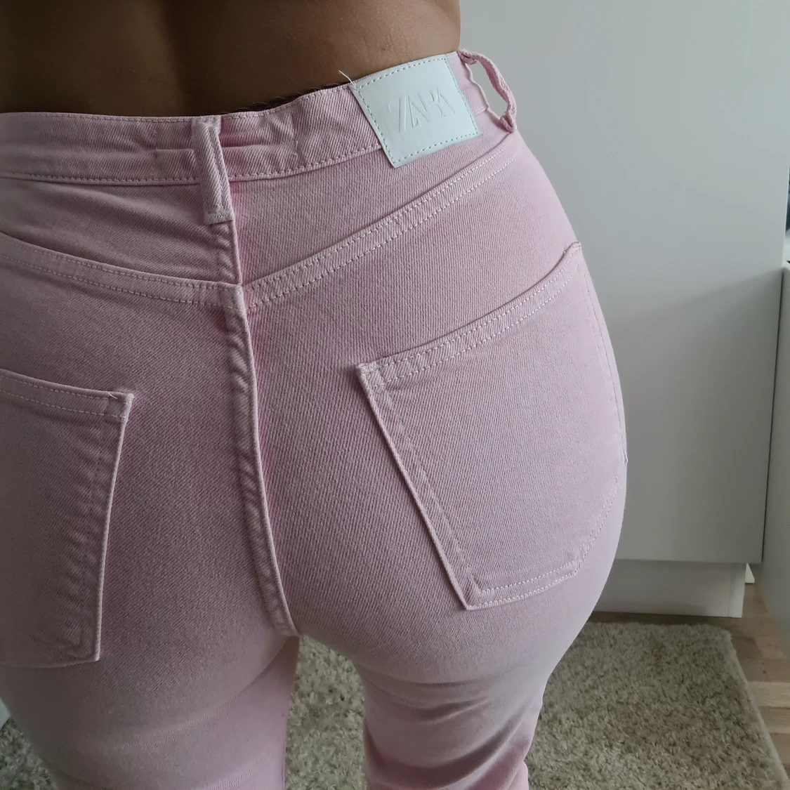 Rosa Slim Flare jeans från Zara. Jag har klippt av dom så de skulle passa mig som är 165cm. Storlek 34. Använda endast 1 gång. Samma som Bianca Ingrosso har. Priset är med inkluderad frakt, klart och ej prutbart!