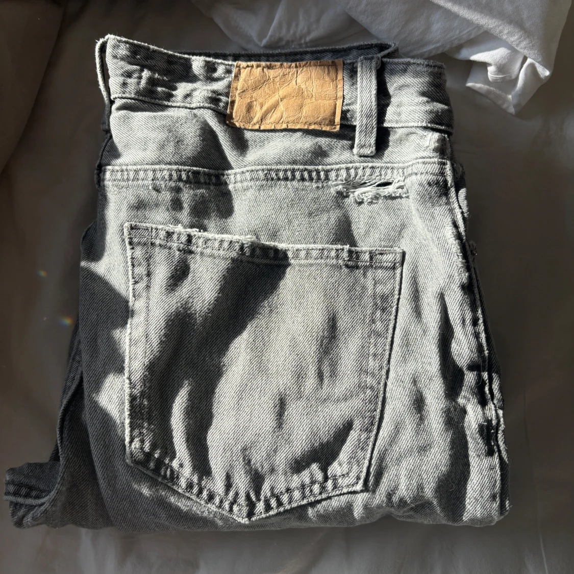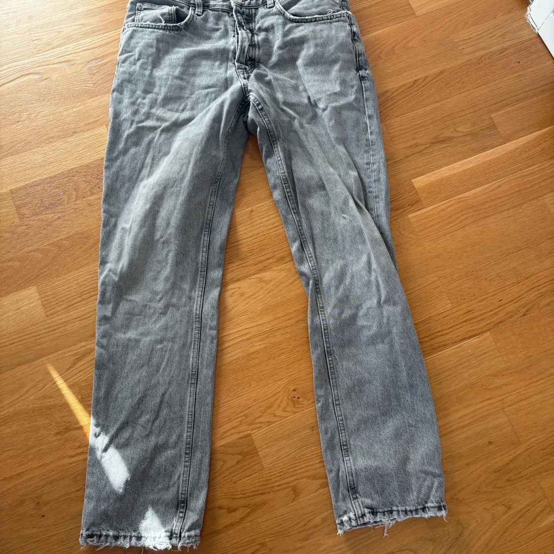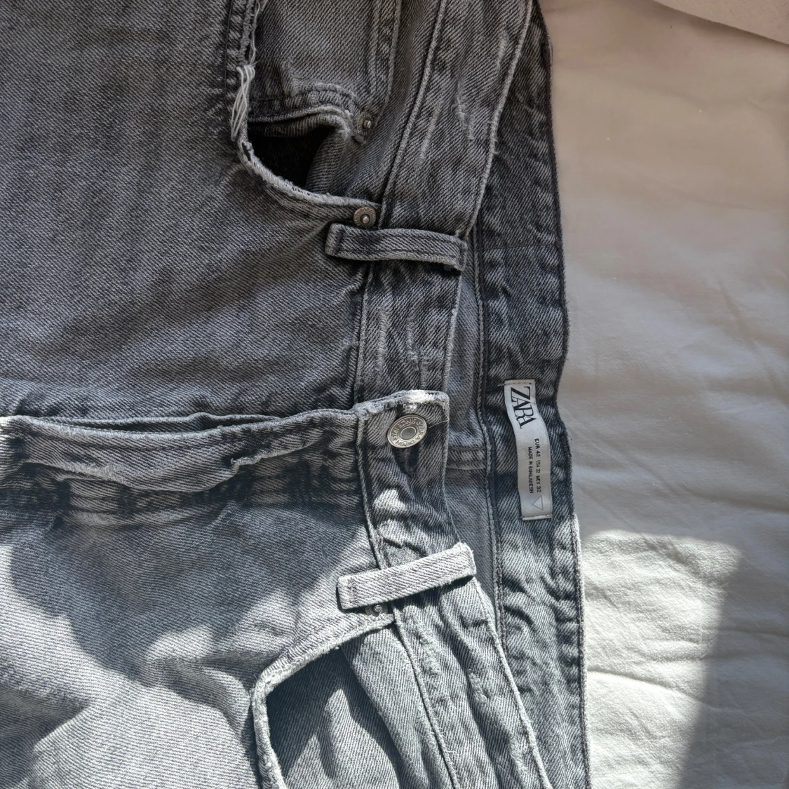 Säljer ett par grå jeans från Zara med raka ben och råa, fransiga benslut. Jeansen har klassisk femficksdesign och en liten sliten detalj ovanför bakfickan. Använda med lite sönder vid fickan sen och sliten vid benen