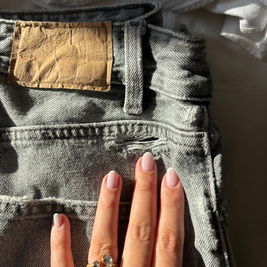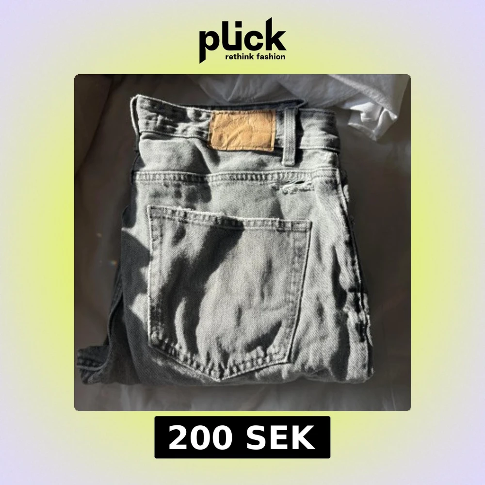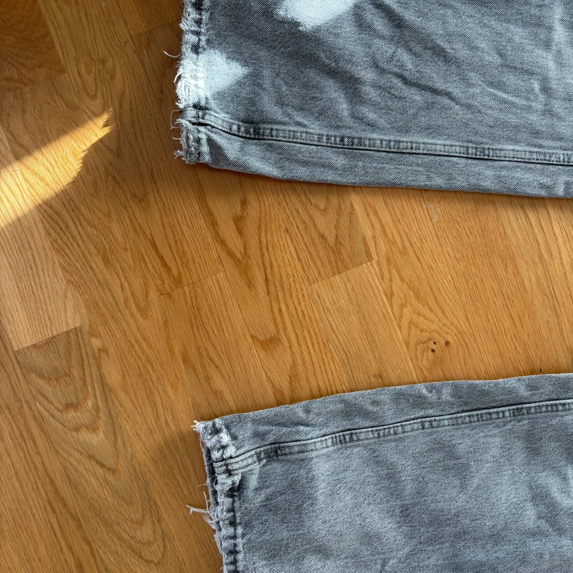 Säljer ett par grå jeans från Zara med raka ben och råa, fransiga benslut. Jeansen har klassisk femficksdesign och en liten sliten detalj ovanför bakfickan. Använda med lite sönder vid fickan sen och sliten vid benen