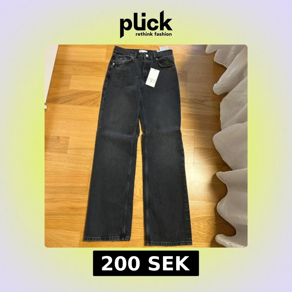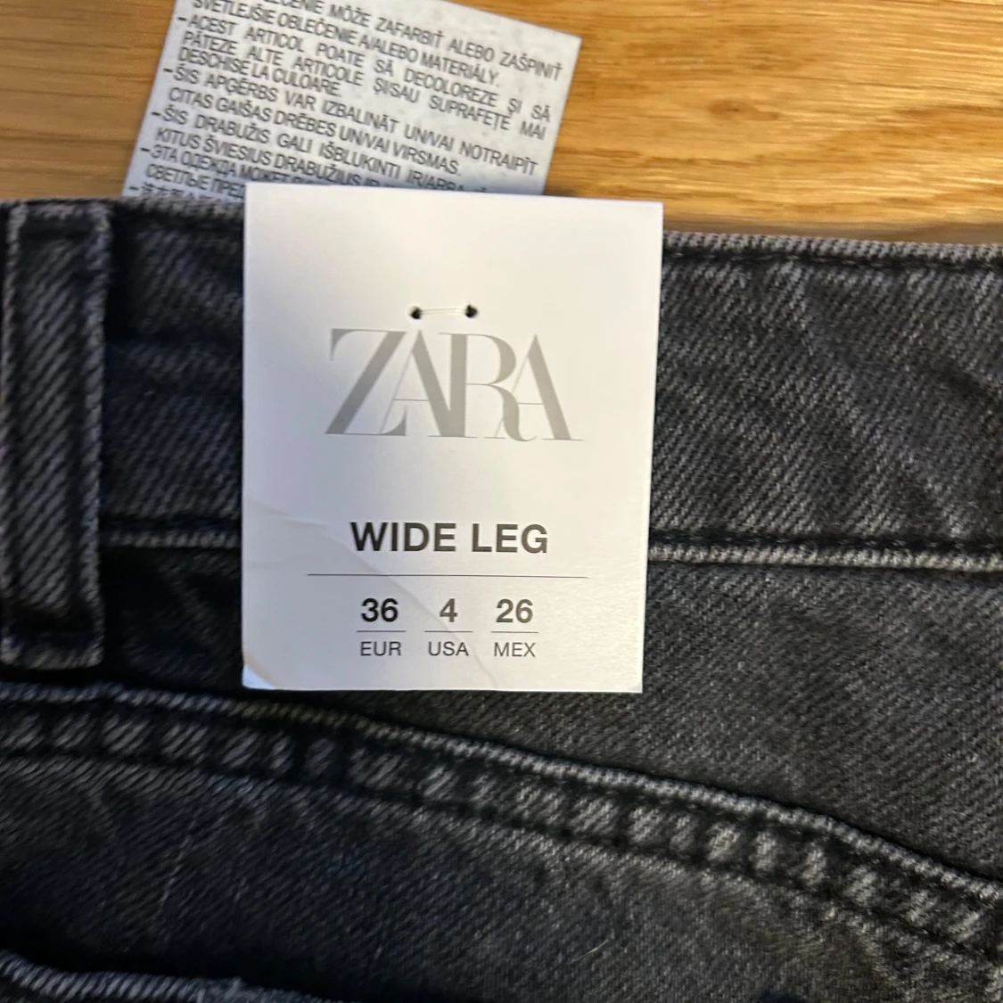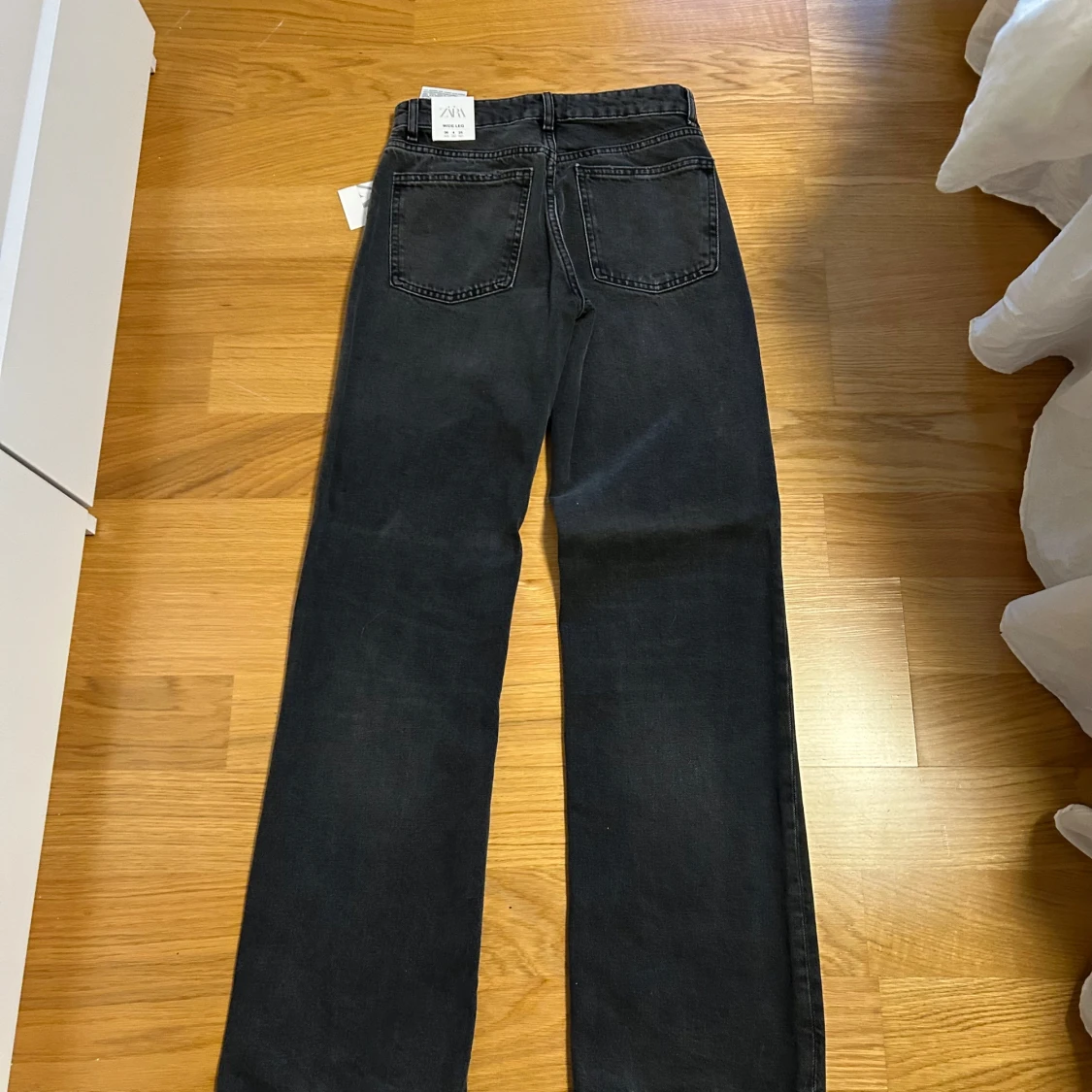 Säljer ett par svarta wide leg jeans från Zara i storlek 36. Byxorna har klassisk femficksdesign, hög midja och raka, vida ben. Perfekta för en trendig och avslappnad look. Materialet är denim med en lätt tvättad finish. Aldrig anvönda, lappen sitter kvar!