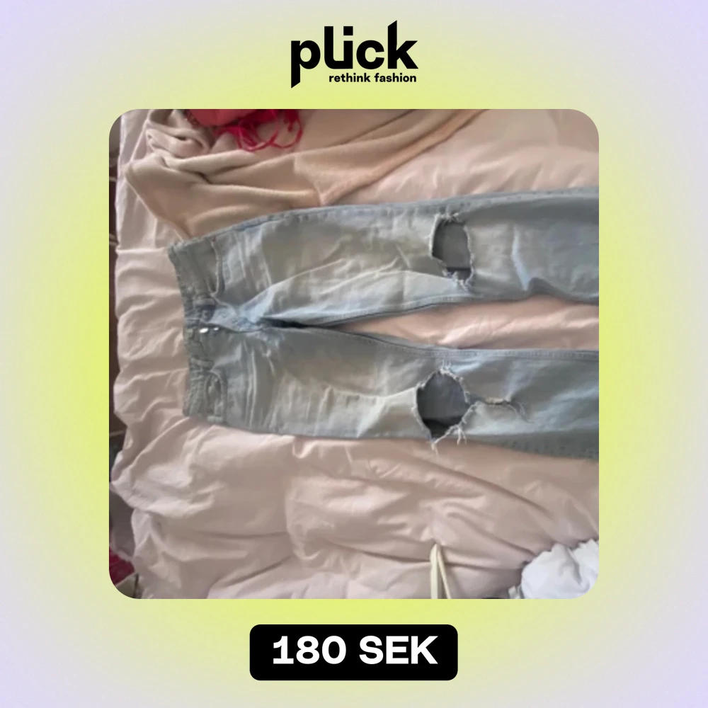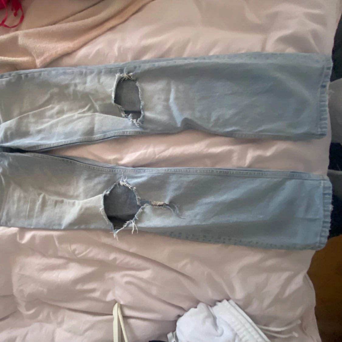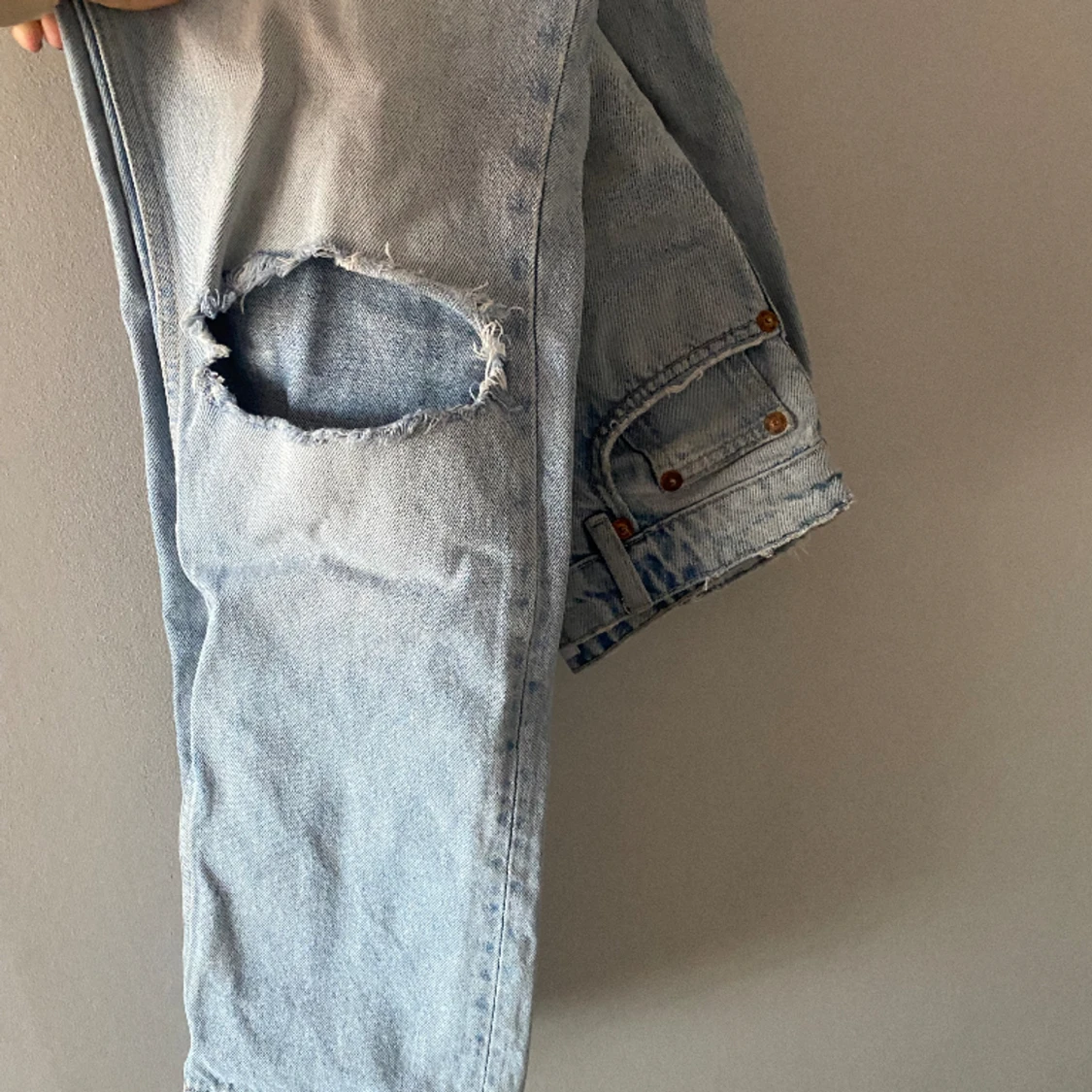 Zara jeans i modellen straight mid rise! Så fina till sommaren. Ljusblåa hål jeans som passar 36 ! Skriv för fler bilder!! 🩵🩵