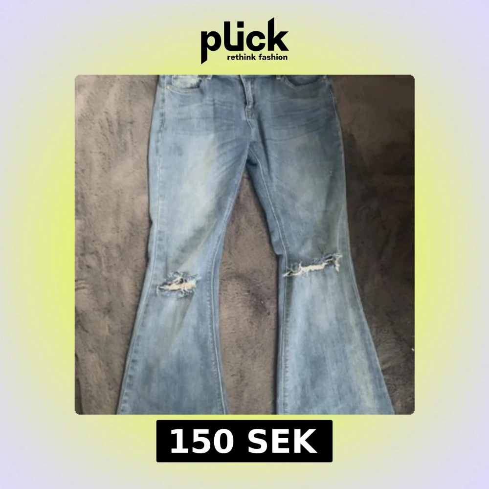Jeansen är bootcut och har hål vid knäna, Passar runt M-L då jag upplever de mindre i storleken. De är lådmidjade och har en fin passform. Sälja för jag tycker de har blivit lite förstora på mig.