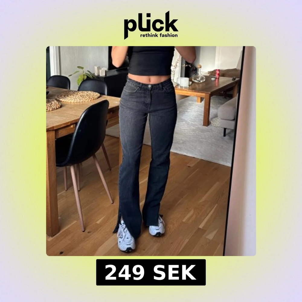 Jeans i urtvättad svart med ”raw edge” slits längst med sidan vid fötterna. Något slitet på baksidan vid fötterna (se bild 2), men inget man riktigt tänker på dock eftersom det är precis vid kanten. (Tips, säljs billigare på min Vinted då de ej tar 5% av försäljningen, @emmasandbrg)