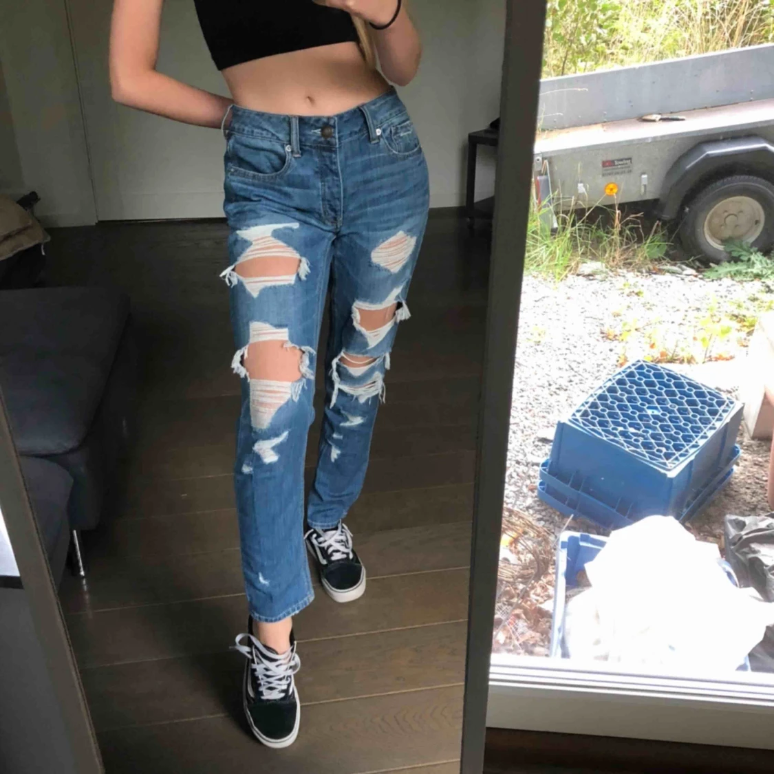 Super fina och sköna jeans ifrån American eagle med slitningar i modellen ”tomgirl” (köpta i usa). Storleken är ”2” vilket motsvarar en W27 som är ungefär en S. Kan mötas upp i Stockholm eller så står köparen för frakt.
