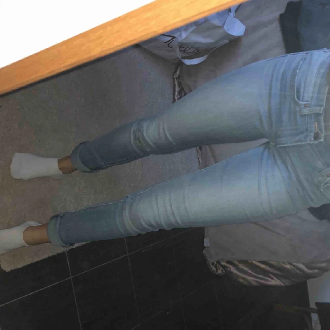 Snygga ljusblå jeans från Levis. Långa i benen så passar många längder. Kan sys upp osv. Lappad på ett knä men då lappen är i samma färg som tyget syns det inte. 711 skinny.