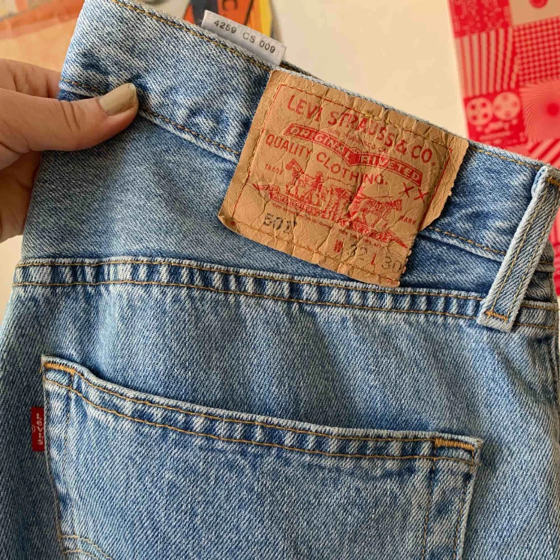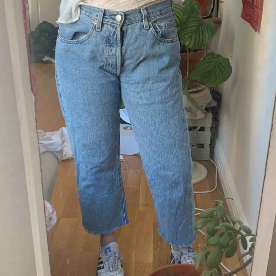 Ljusblå vintage Levis 501 i strl 32!! Sitter mer som en waist 30 skulle jag säga. Typ medium kanske. Avklippta nere så skulle inte rekommendera till någon längre än 165 cm om man inte gillar den croppade looken