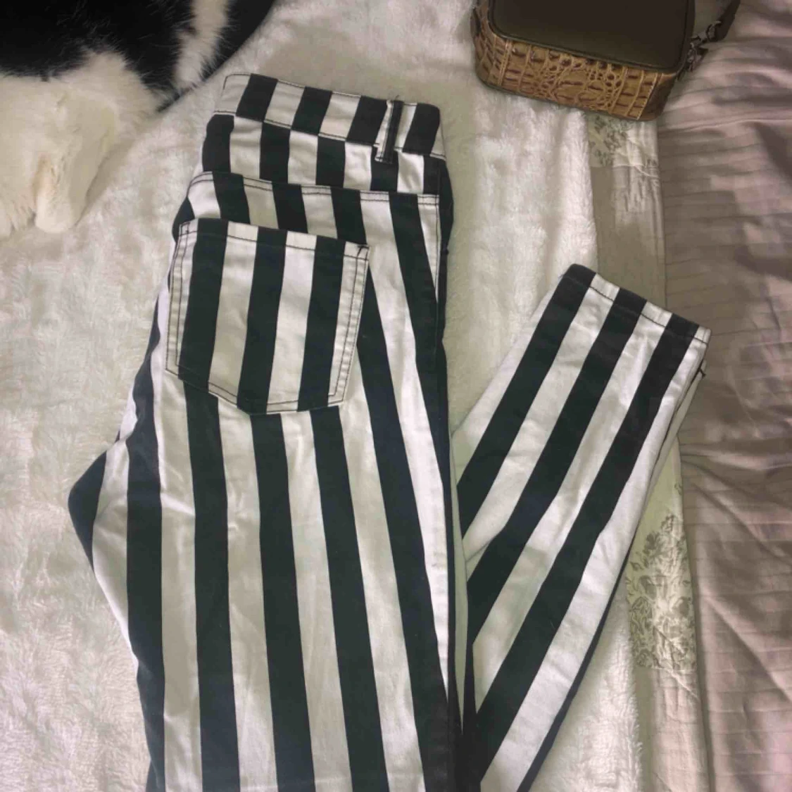 Svart och vitrandiga jeans från monki. Är i fint skick men har dock en skråma (bild 3). Frakt tillkommer!🔥🔥