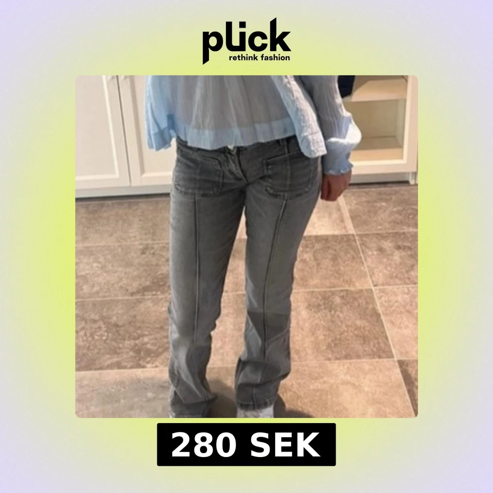 Snygga lågmidjade grå jeans med unika fickdetaljer där fram. Perfekta för vardag och passar till nästan vilken överdel som helst!! Skulle passat ngn som är ca 160 cm!! Köpta för 360kr, säljer pga att jag beställde fel storlek de är lite lösa på mig, har använt 1 gång! 💗😚