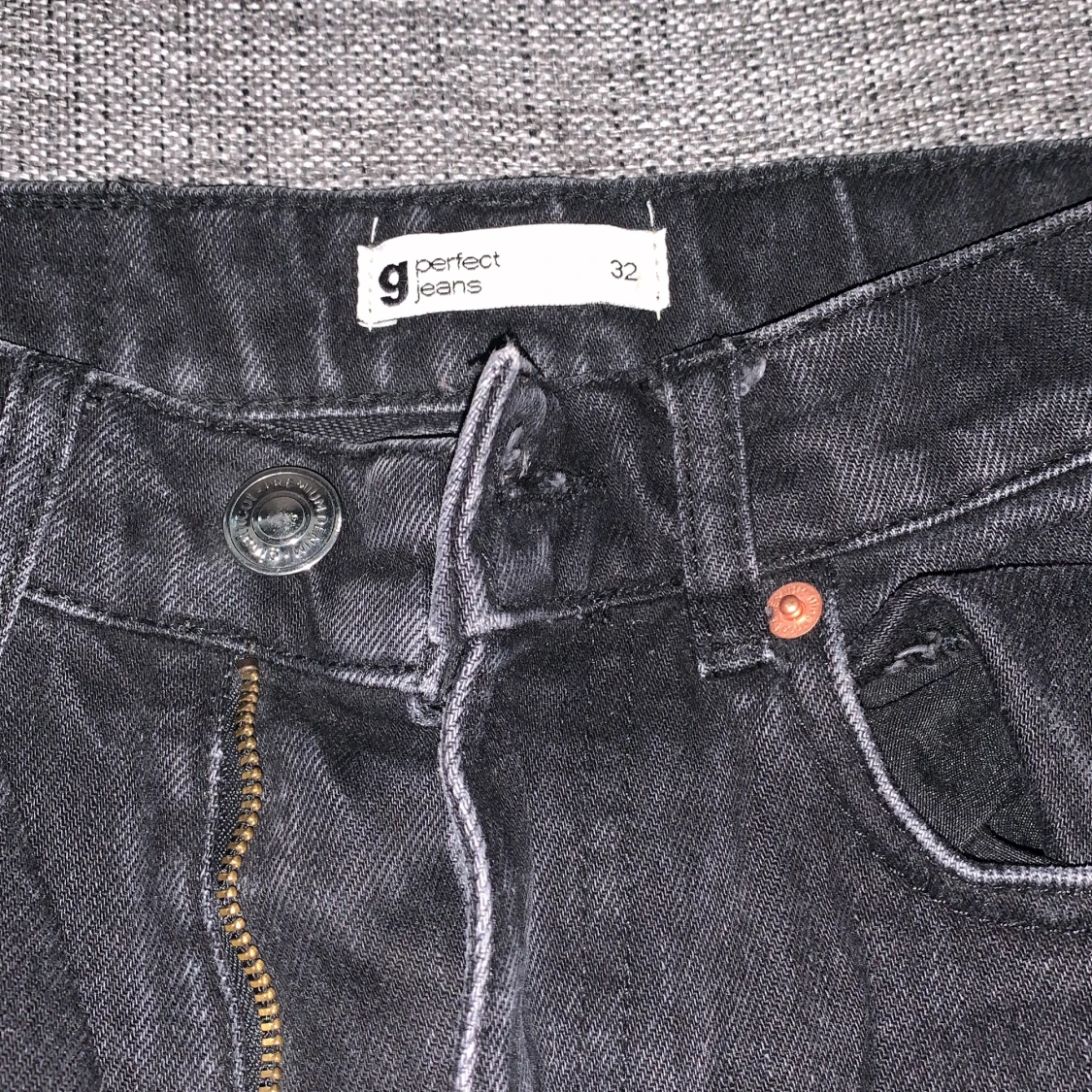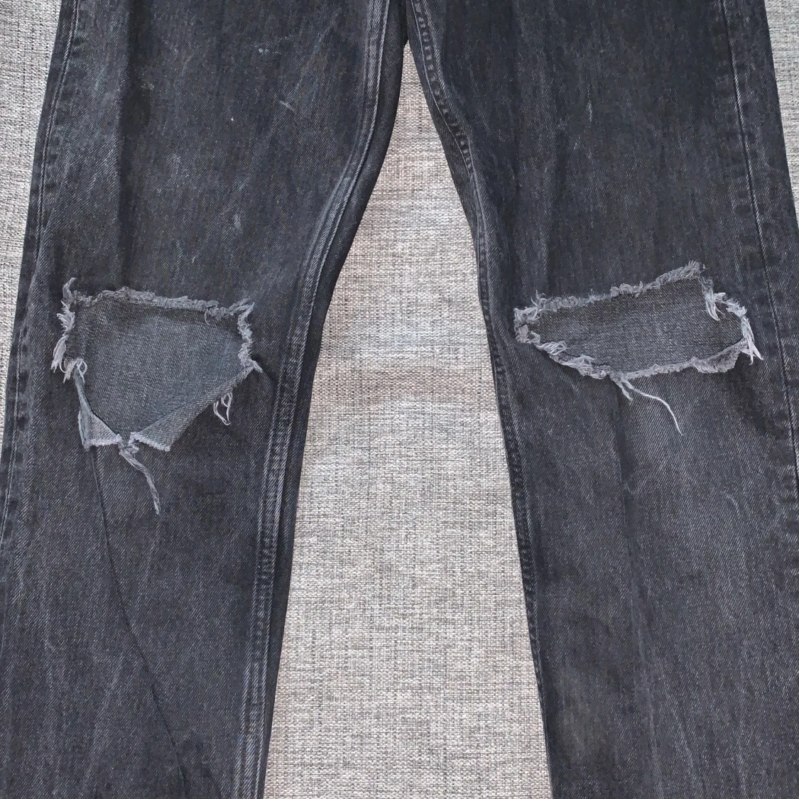 Svarta stentvättade jeans med hål på knäna. Använda ett fåtal gånger. Normal midja med raka ben