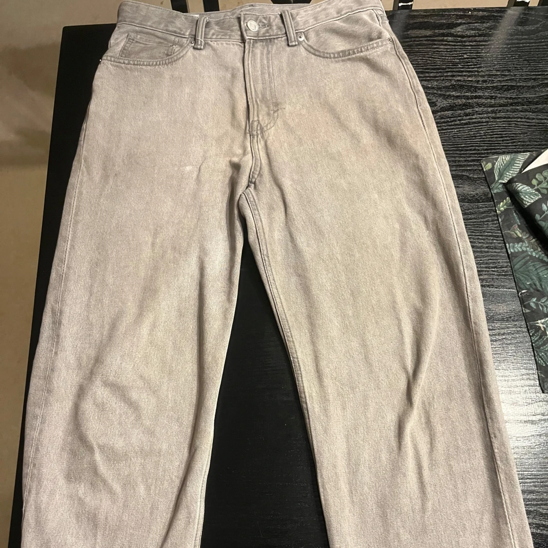 Säljer ett par gråa loose fit jeans från H&M i storlek 30/32. Byxorna har klassisk femficksdesign, raka ben och är tillverkade i ett mjukt jeanstyg. Perfekta för en avslappnad och trendig stil.