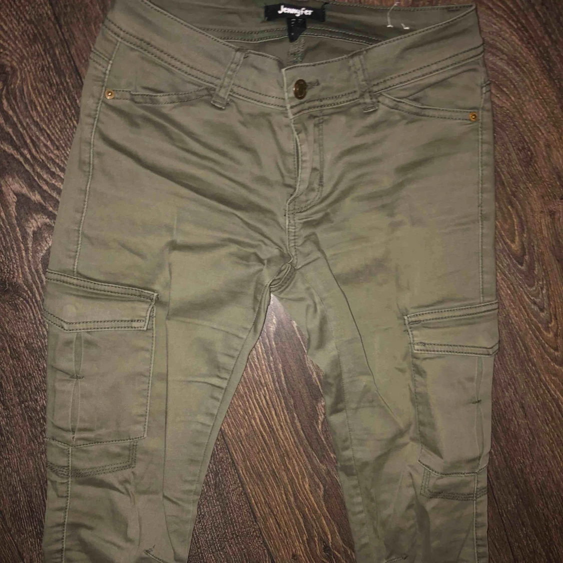Ett par jättefina marin gröna cargo byxor, de är i bra skick förutom att en skärphållare gått av som man kan se på den sista bilden.