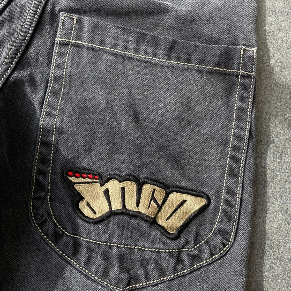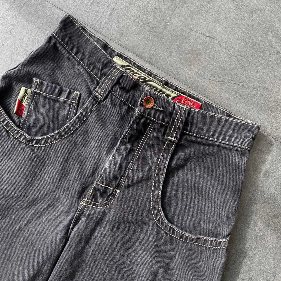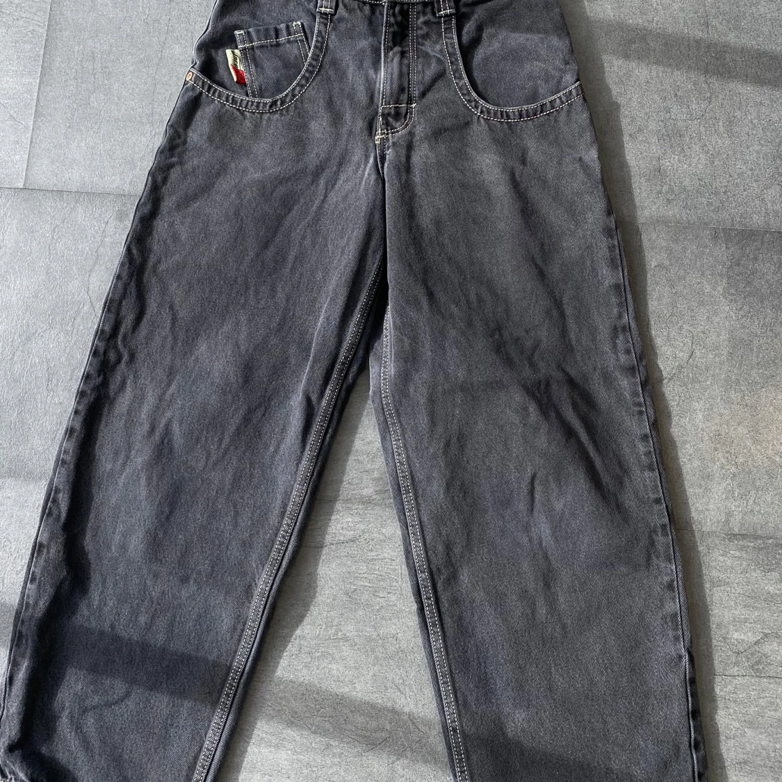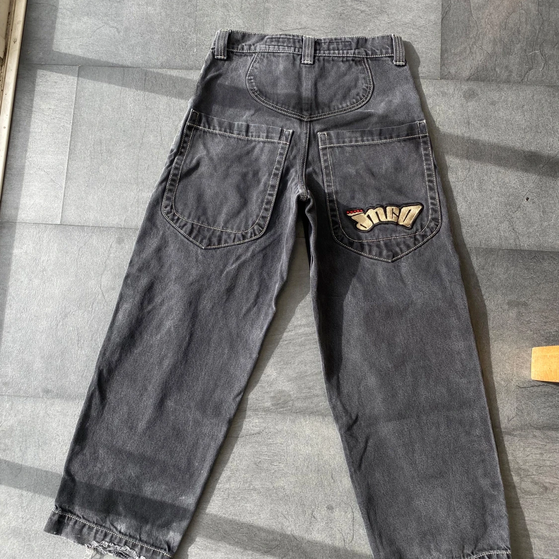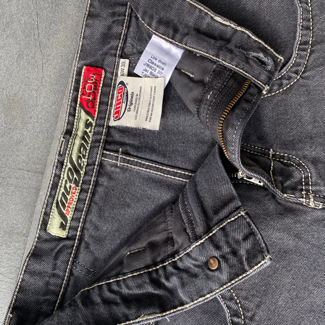 Classic JNCO Low Down jeans in a faded black/gray wash with that perfect worn-in look. Size 30W x 30L. In great condition with just tiny heel bites — nothing that affects the overall look or wear. Super clean fit, wide leg, and that iconic 2000s vibe. A rare piece in this good of shape.