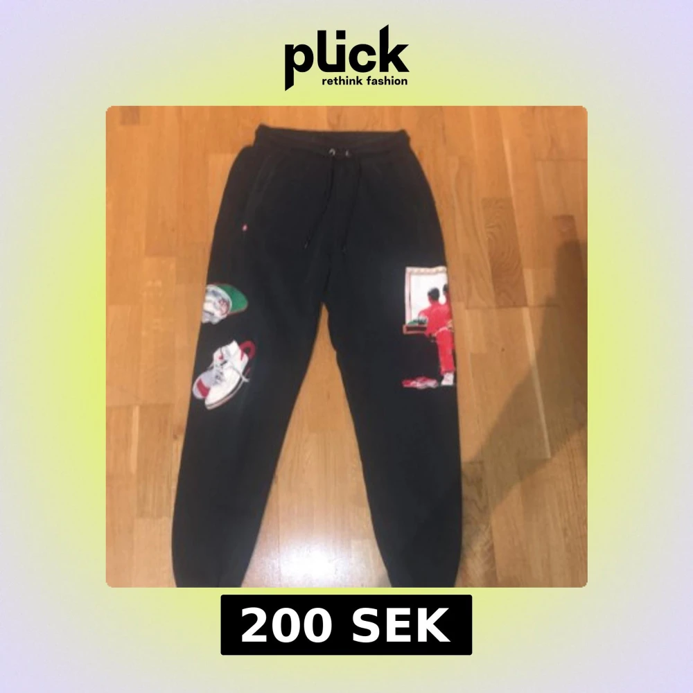 Svarta mjukisbyxor från Jordan med färgglada tryck av sneakers och en person i rött på benen. Byxorna har snörning i midjan och muddar vid bensluten. Perfekta för en streetwear-look och riktigt sköna att chilla i.
