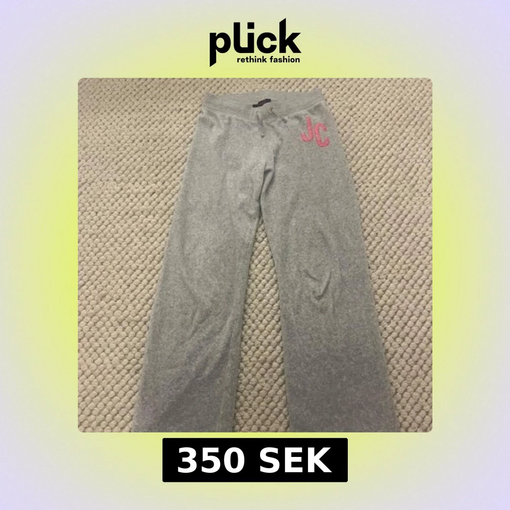 Snygga grå mjukisbyxor från Juicy Couture med rosa glittriga JC-bokstäver på. Byxorna har en bekväm passform med ett snöre i midjan och är sparsamt andvända!