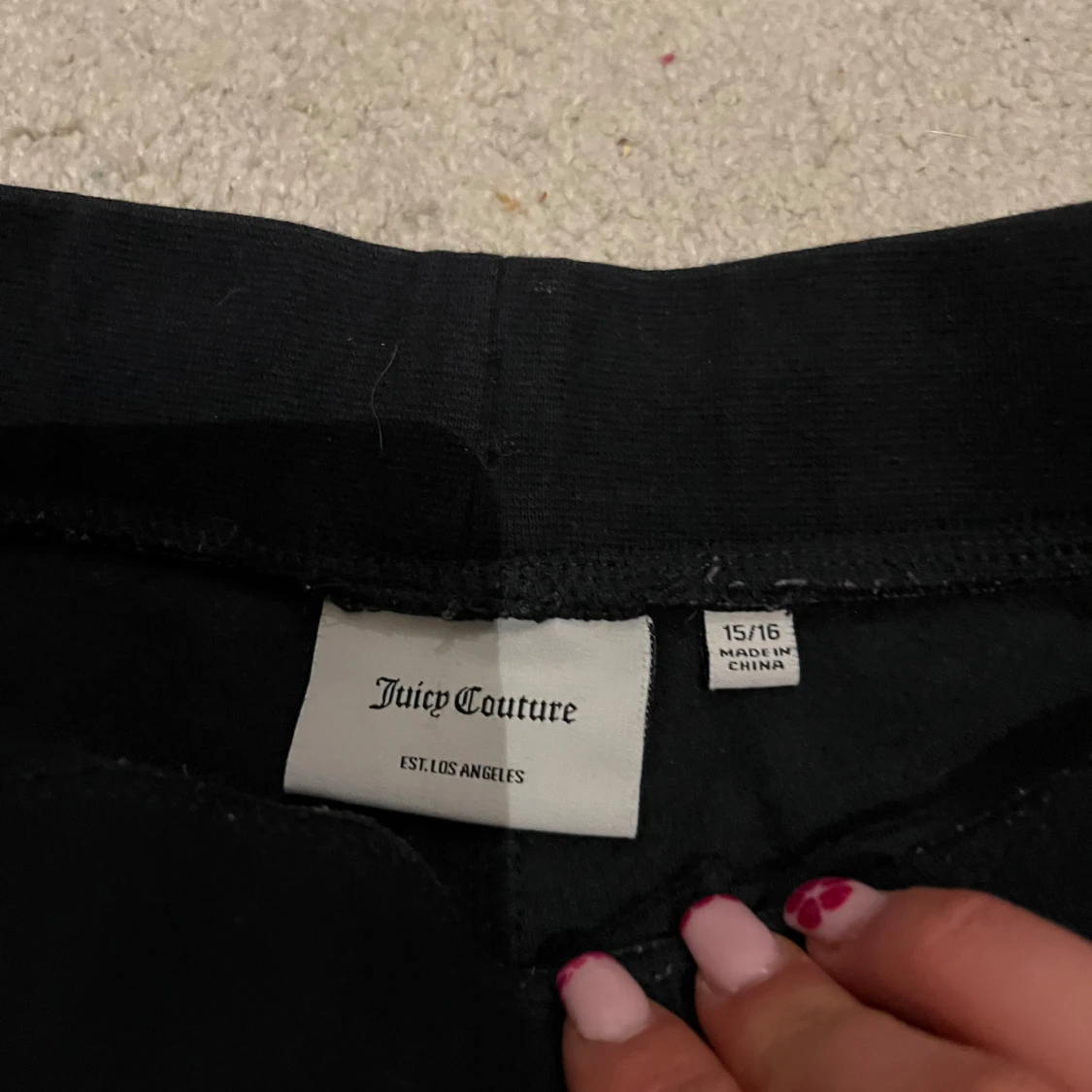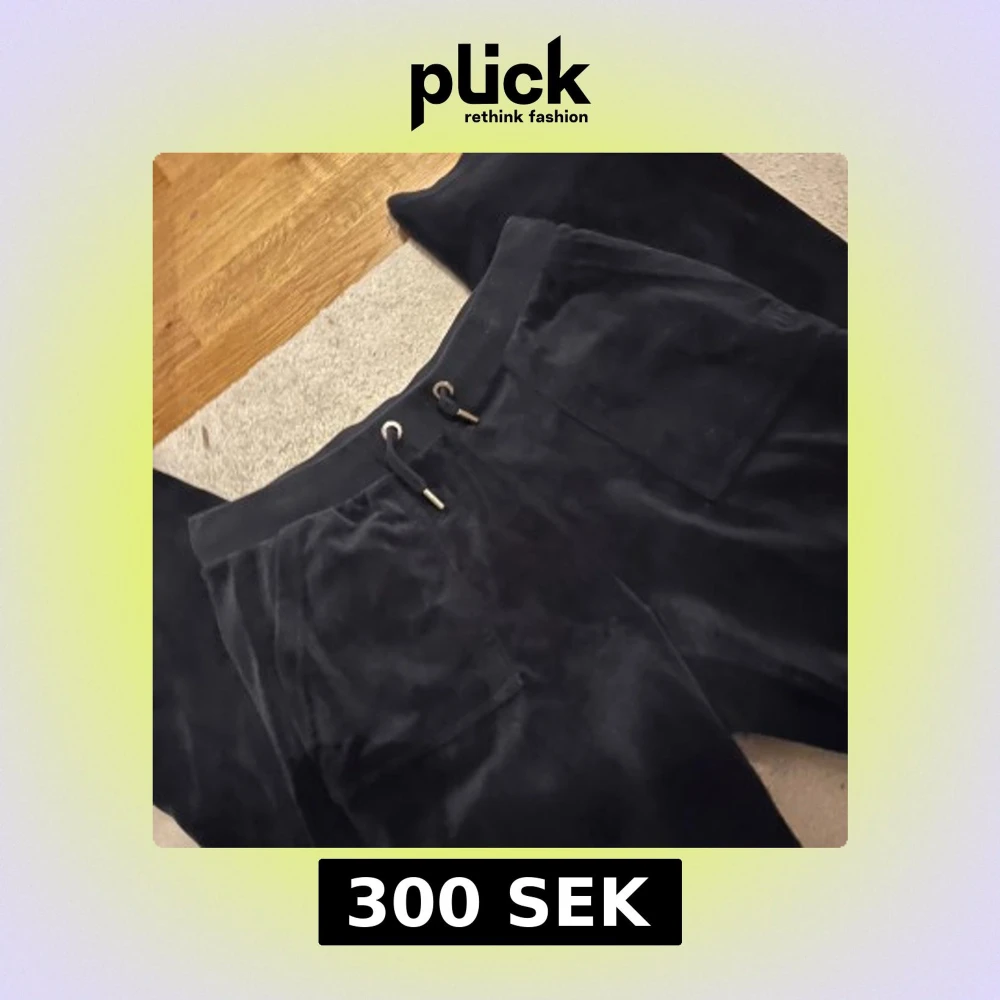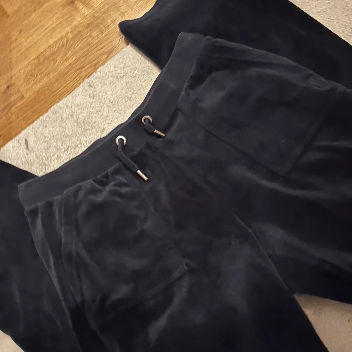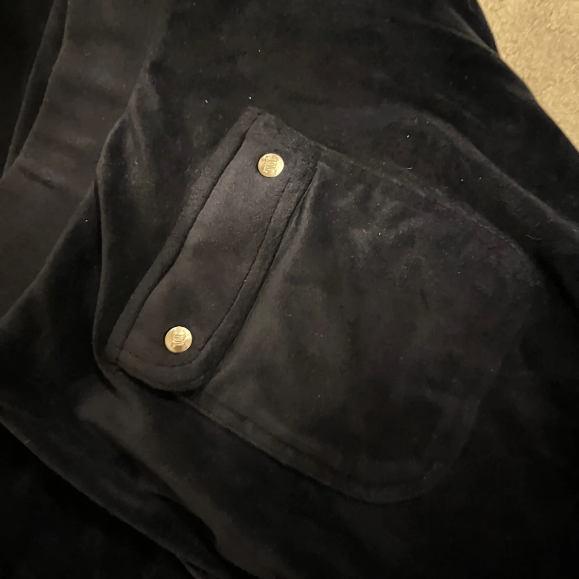 Säljer ett par mörkblå mjukisbyxor från Juicy Couture. Byxorna har en bekväm passform med snörning i midjan och praktiska fickor med knappar. Perfekta för en avslappnad stil.