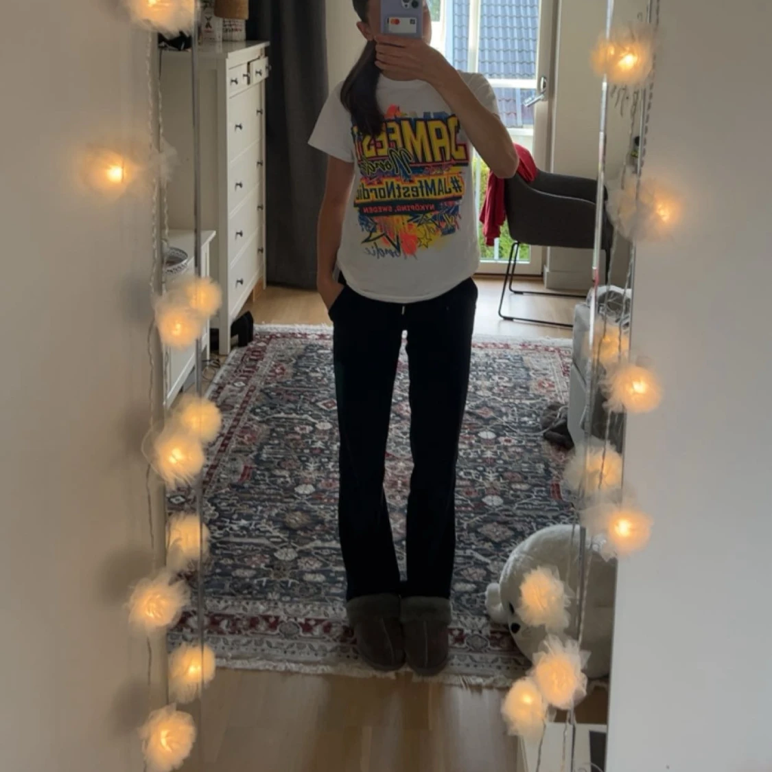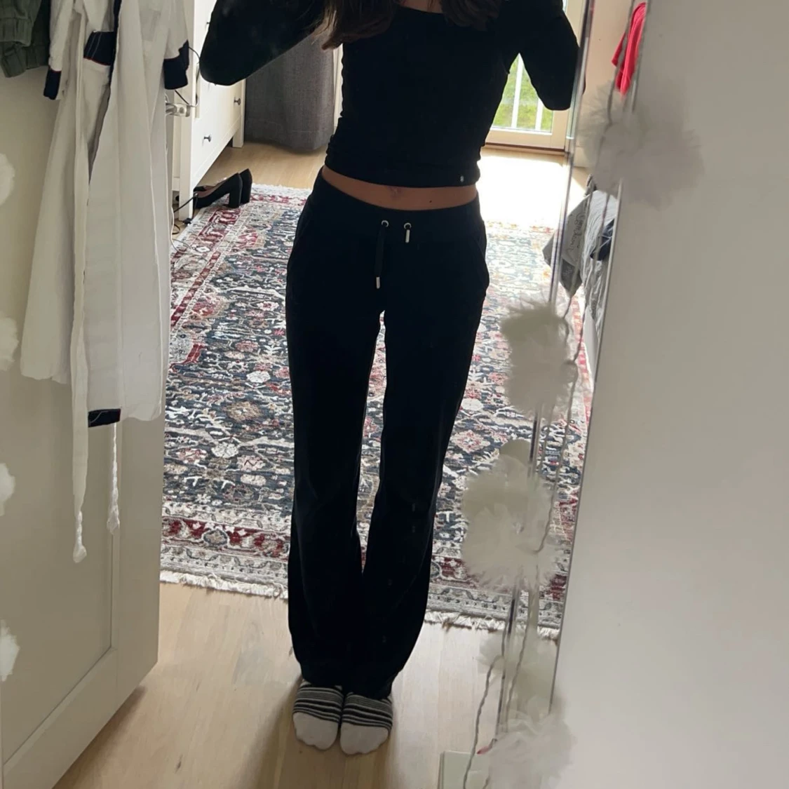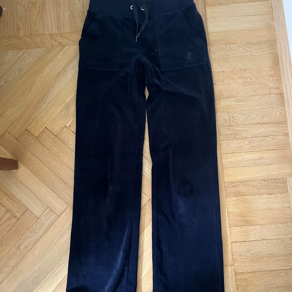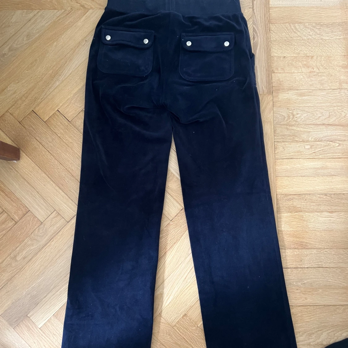 Mörkblåa juicy byxor i mjukt sammetstyg med snörning i midjan. Byxorna har raka ben, stora fickor fram och bak med knappdetaljer. Väldigt sköna och i bra skick! Säljer då jag växer ur❤️