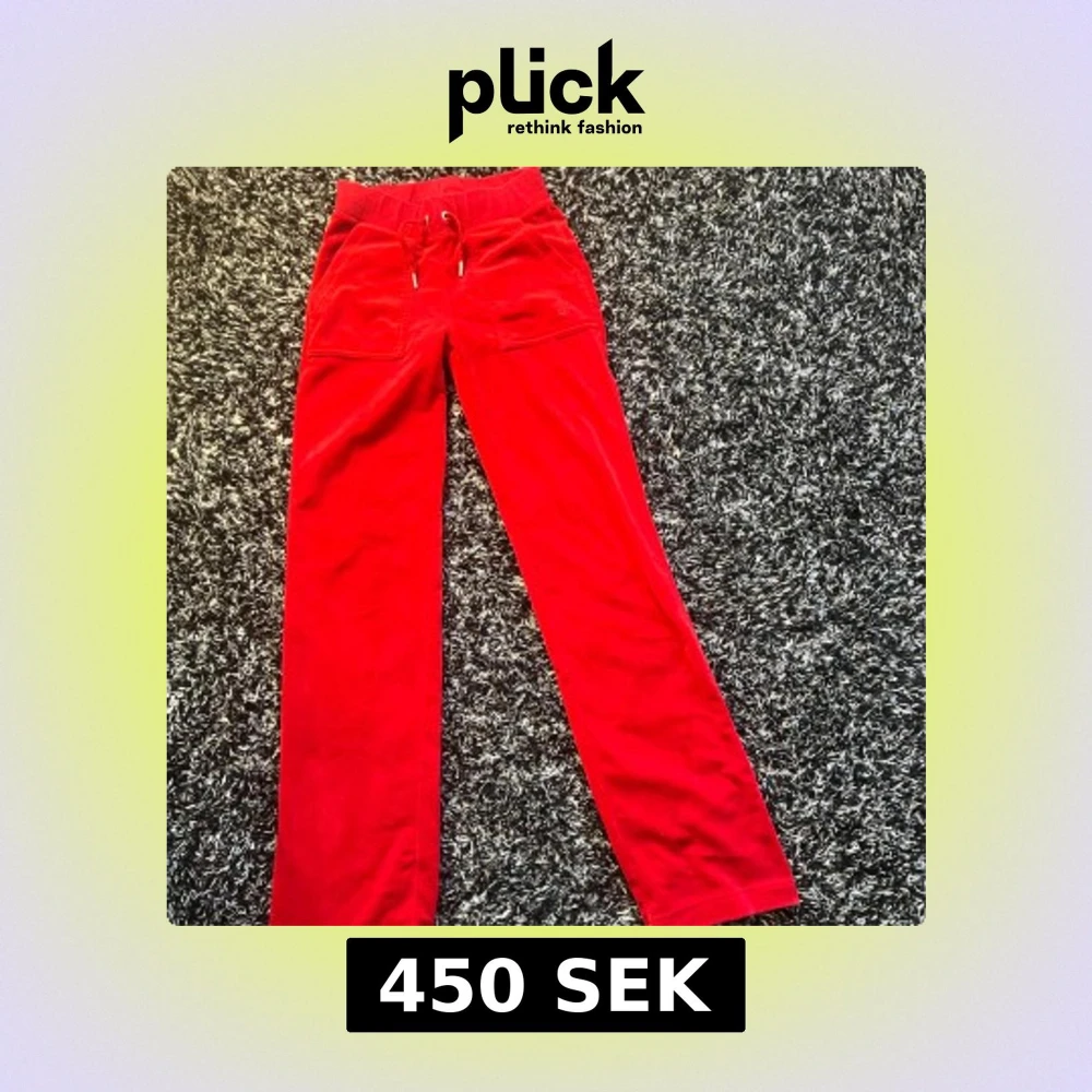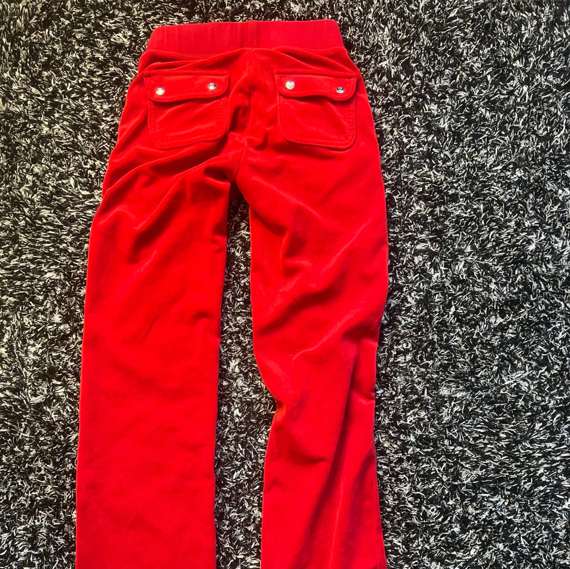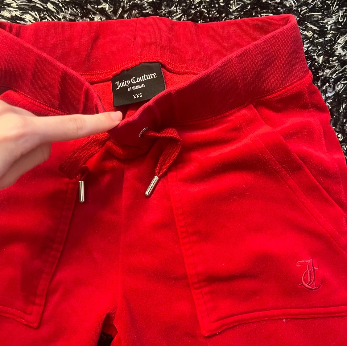 Säljer ett par klassiska röda velourbyxor från Juicy Couture med snörning i midjan och fickor både fram och bak. Byxorna har broderad logga på ena fickan och är perfekta för en avslappnad stil.