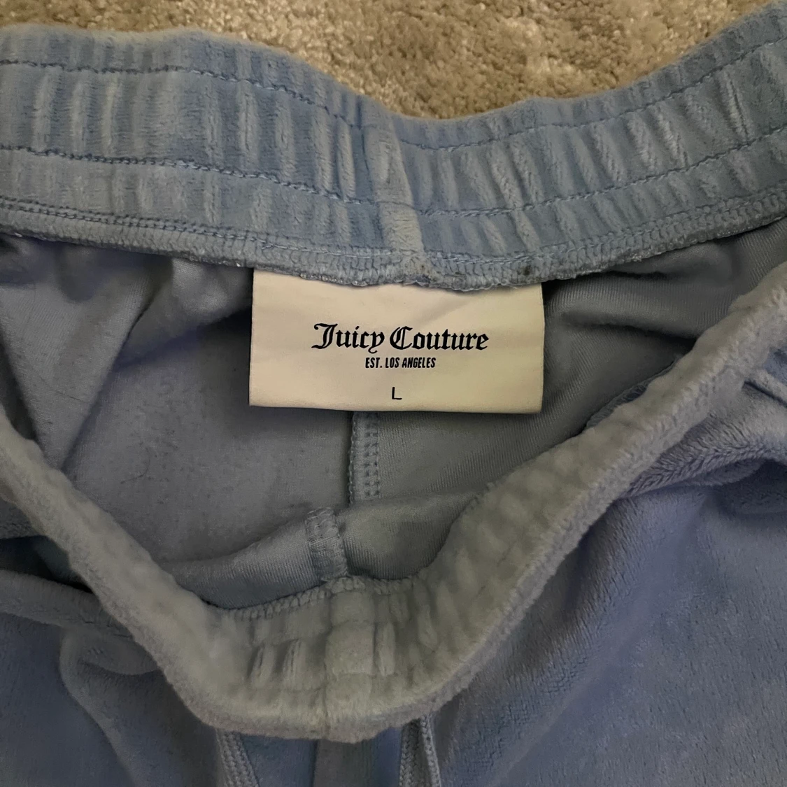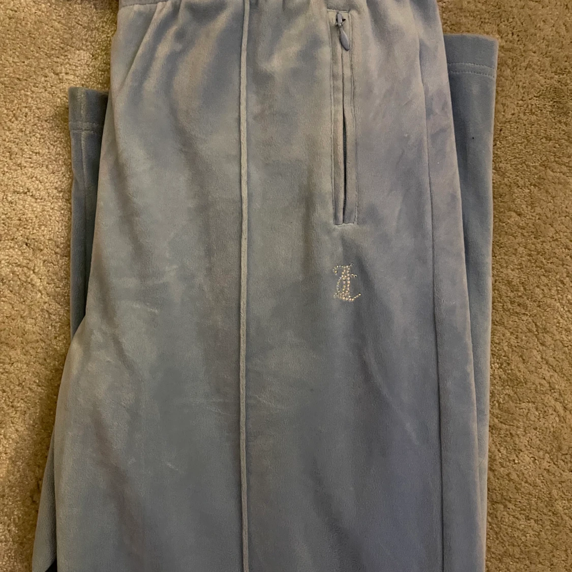 Blåa juicy byxor med fickor som har dragkedja, köpta på juicy coutures egna hemsida. Är i stolek L och är i jättebraskick och år lång i benen. Är använda fåtal gånger.