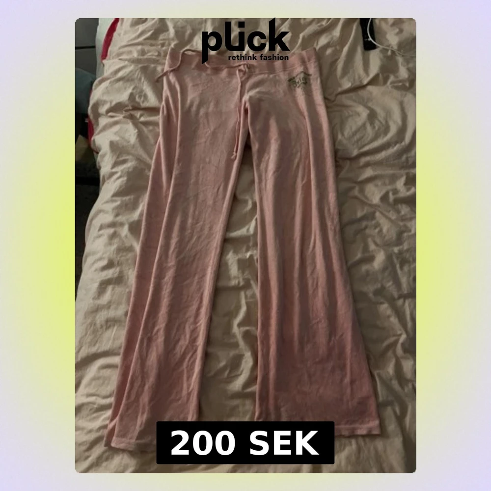 Säljer ett par ljusrosa mjukisbyxor från Juicy Couture i storlek large. Byxorna har snörning i midjan, bootcut-snitt och ett grönt tryck på höften. Materialet är mjukt med 80% bomull och 20% polyester, perfekt för chill dagar.