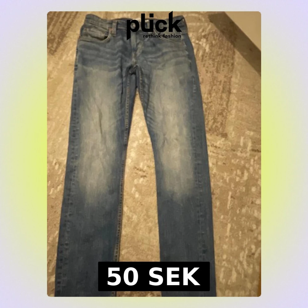 Klassiska jeans i blå tvätt med raka ben och normal passform. Jeansen har fem fickor, knappgylf och slitna detaljer för en cool vintagekänsla. Perfekta för dig som gillar tidlös denimstil. Detta var ett par mörkblåa Bootcut jeans men jag råkade tvätta de på fel program så det blev som ett par helt nya jeans i en annan färg, nu är de mer som lite lösare skinny jeans för de är inte vida i byxorna längre. De blev faktiskt rätt coola men tyvärr inte min stil. Därav pris🥰