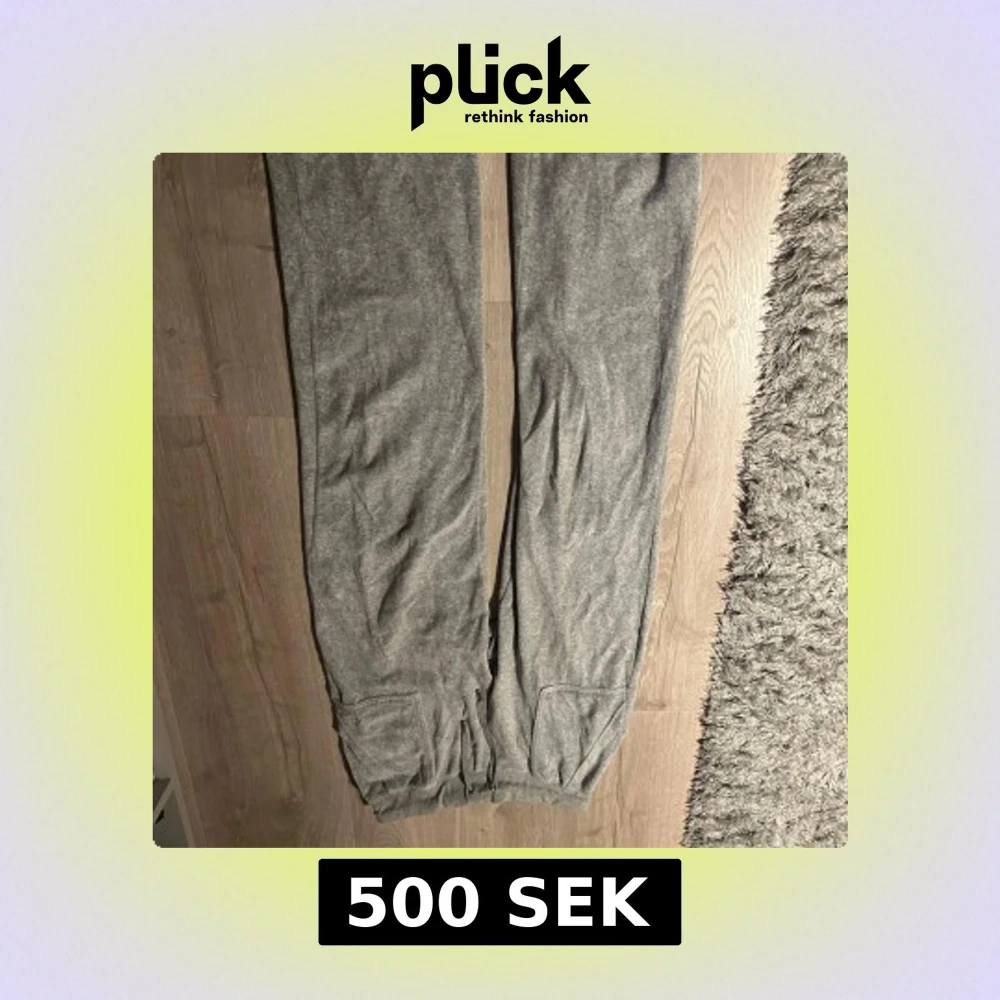 Mysiga grå mjukisbyxor från Juicy Couture i storlek M. Byxorna har resår och snörning i midjan, muddar vid bensluten och bakfickor med knappdetaljer. Tillverkade i mjuk bomullsblandning för extra komfort.