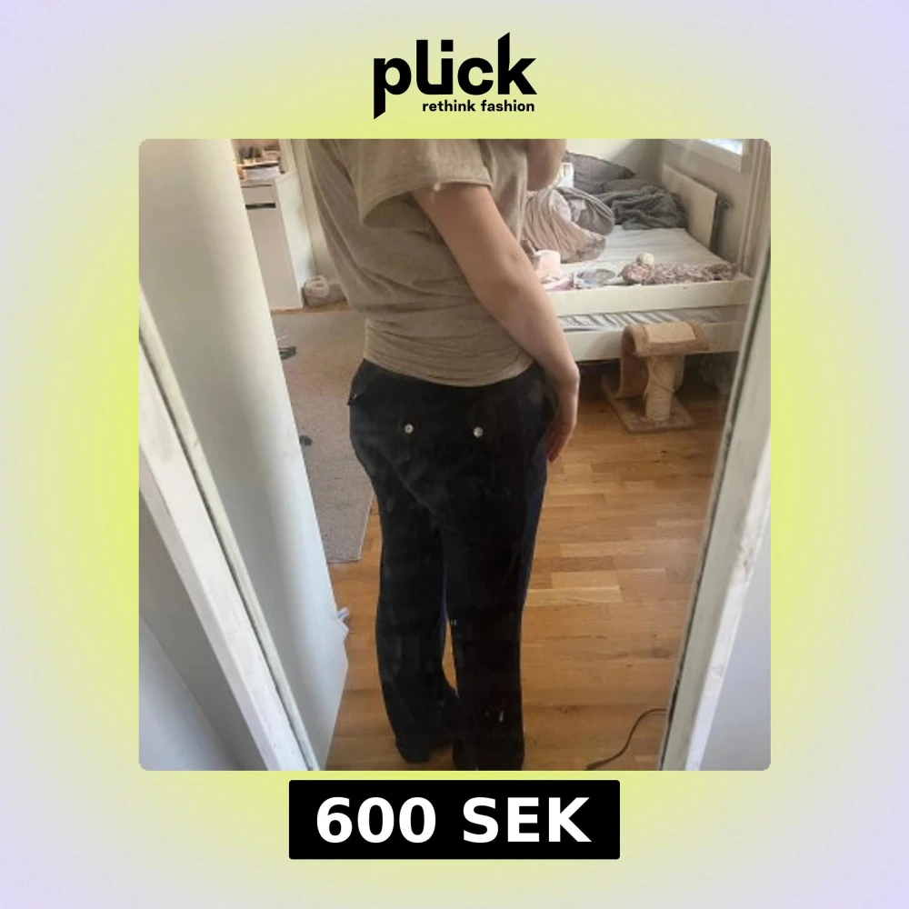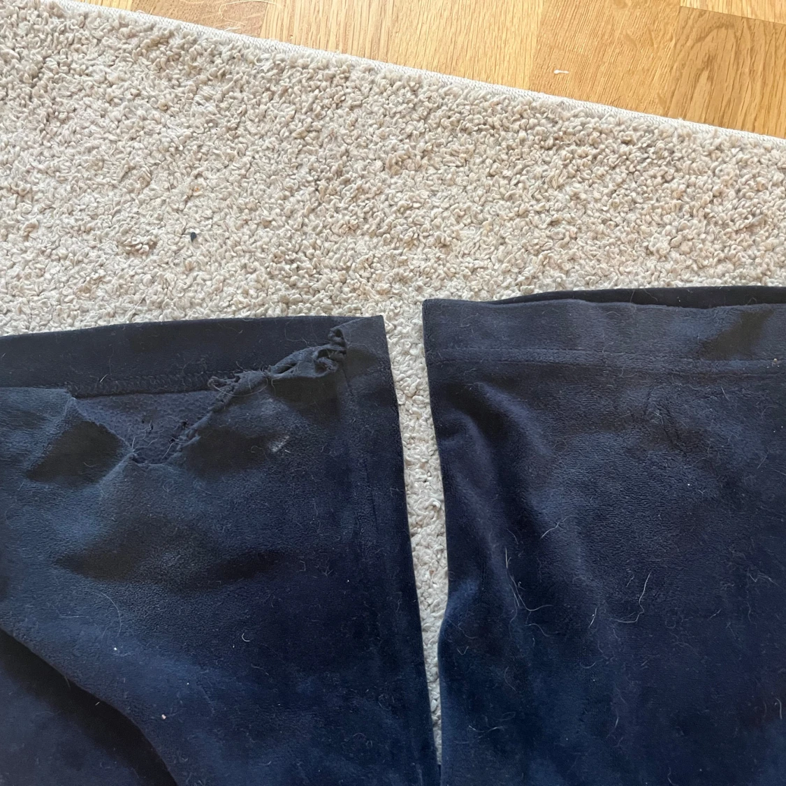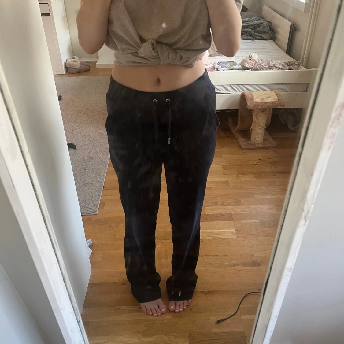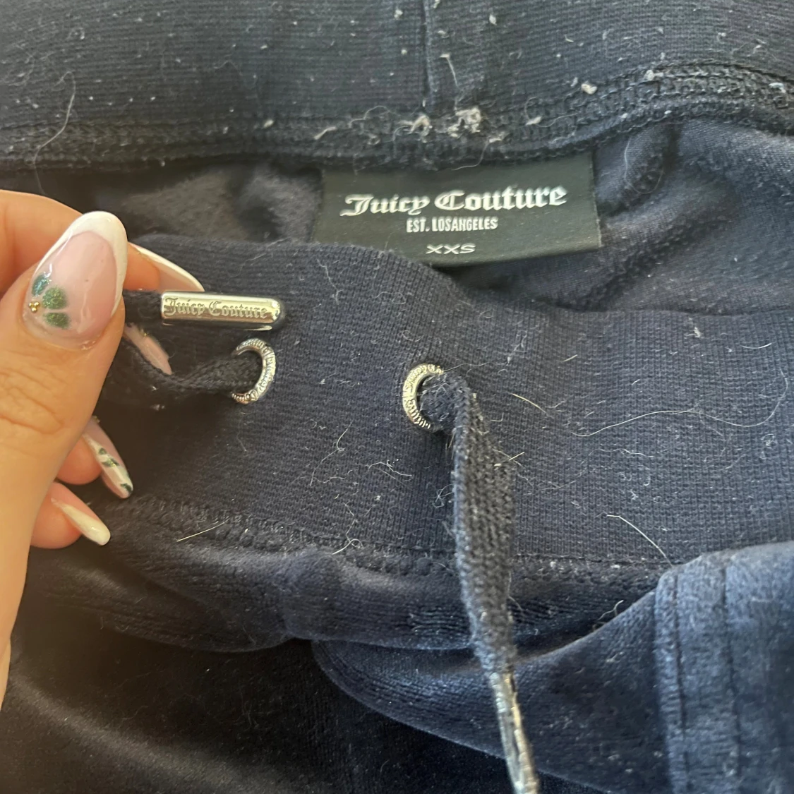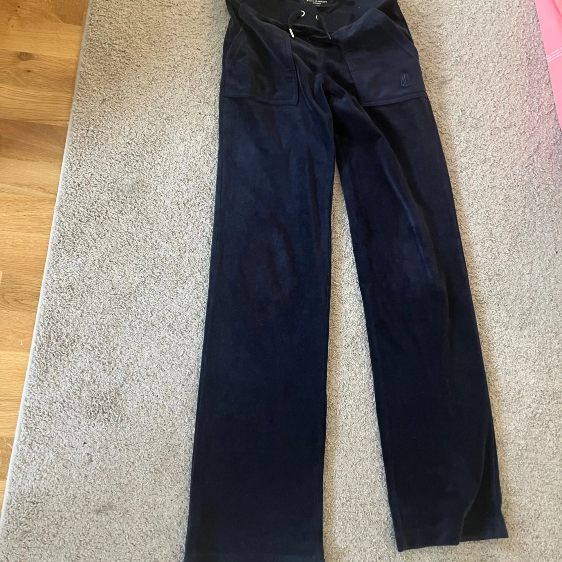 Mörkblå mjukisbyxor från Juicy Couture. Dom saknar en silvrig grej vid smörerna och en av benen är lite trasiga vid fötterna annars jättesköna och fina!